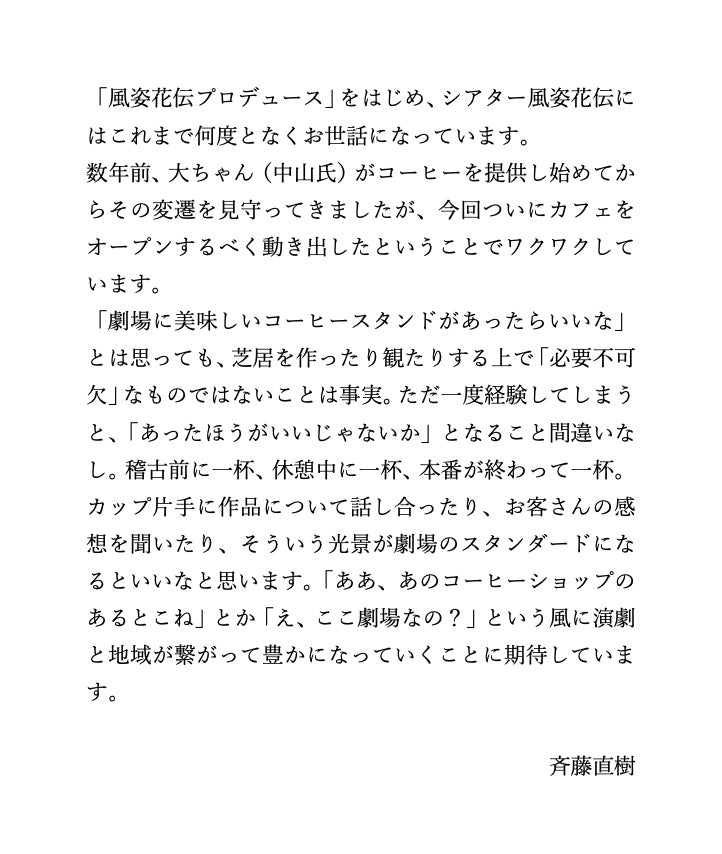 風姿花伝プロデュースvol.3「いま、ここにある武器」に演出・出演していただいた演出家・俳優の千葉哲也さんに応援メッセージをいただきました。初めてロビーにカフェブースを設置したのが、「いま、ここにある武器」の公演でした。その際、客席内に飲み物を持ち込めるようにするか否かで議論になり、迷ったあげく、千葉さんに相談すると「自分は構わない。やってみな」と背中を押してくれたことを覚えています。演出も役者もやりながら、末端の人間のことも慮ってくれる千葉さんという人の懐の深さを感じた瞬間でした。千葉さんは本当に優しい人です。その千葉さんが演出されている「反応工程」が新国立劇場で25日まで上演されています。「反応工程」https://www.nntt.jac.go.jp/play/reactionprocess/千葉さん、ありがとうございます。======================コロナ禍で人々がやや内向きになり、感染対策で劇場でもなかなか人と言葉が交わせない今…良質な美味い珈琲を飲み、せめてマスクの下が笑顔になって頂ければ…シアター風姿花伝コーヒースタンドを応援します。千葉哲也======================