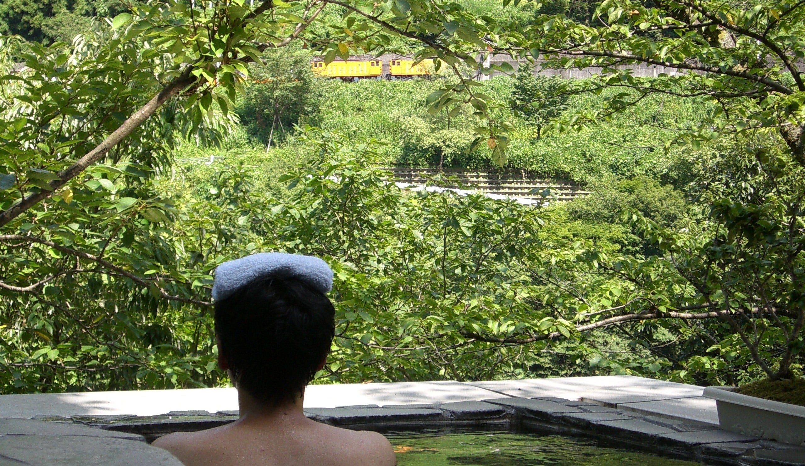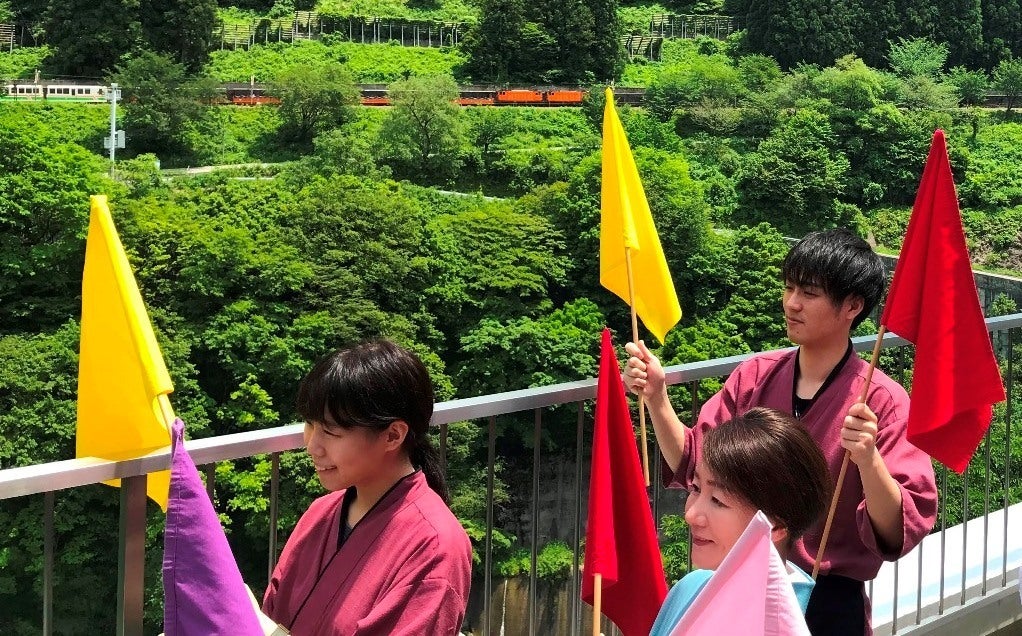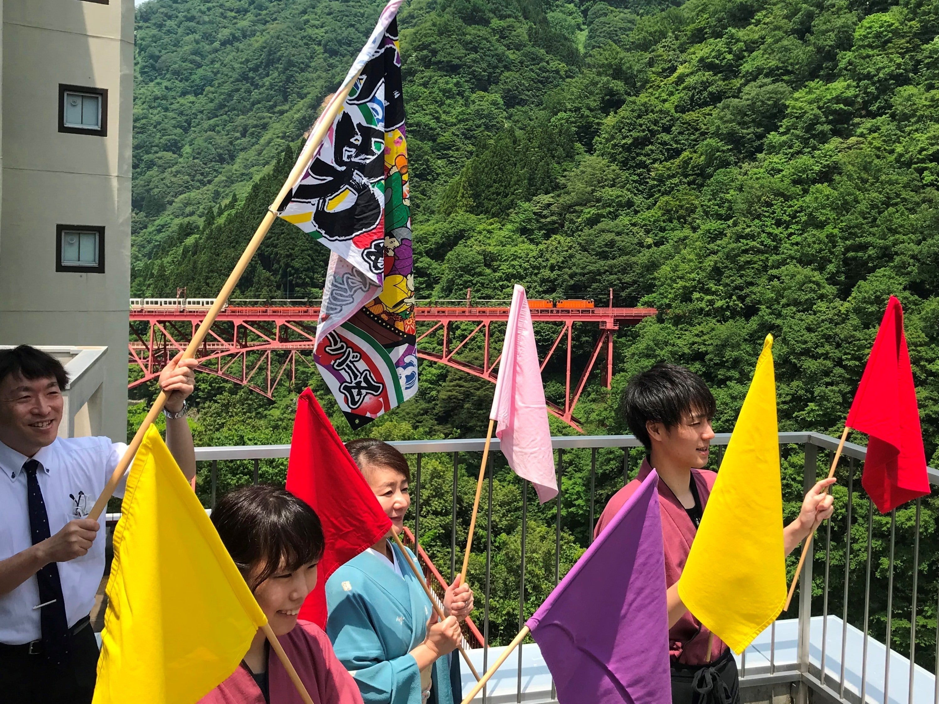 写真を見ていただくと、当館スタッフがトロッコ電車に向かって旗を振っている様子がお分かりいただけると思います。対岸を走るトロッコ電車に手を振ると、乗っているお客様が手を振り返してくれるのが見えるんです。とっても嬉しい気持ちになれます。私どもにしか出来ないおもてなしであり、この仕事の喜びの一つす。 黒部峡谷の大自然の中を走るトロッコ電車。それに乗っているお客様と、こんな風にコミュニケーションが取れるのは当館だけなんです。当館を利用されるお客様だけではなく、宇奈月温泉を訪れてトロッコに乗る全てのお客様に感謝をこめて手を振っています。