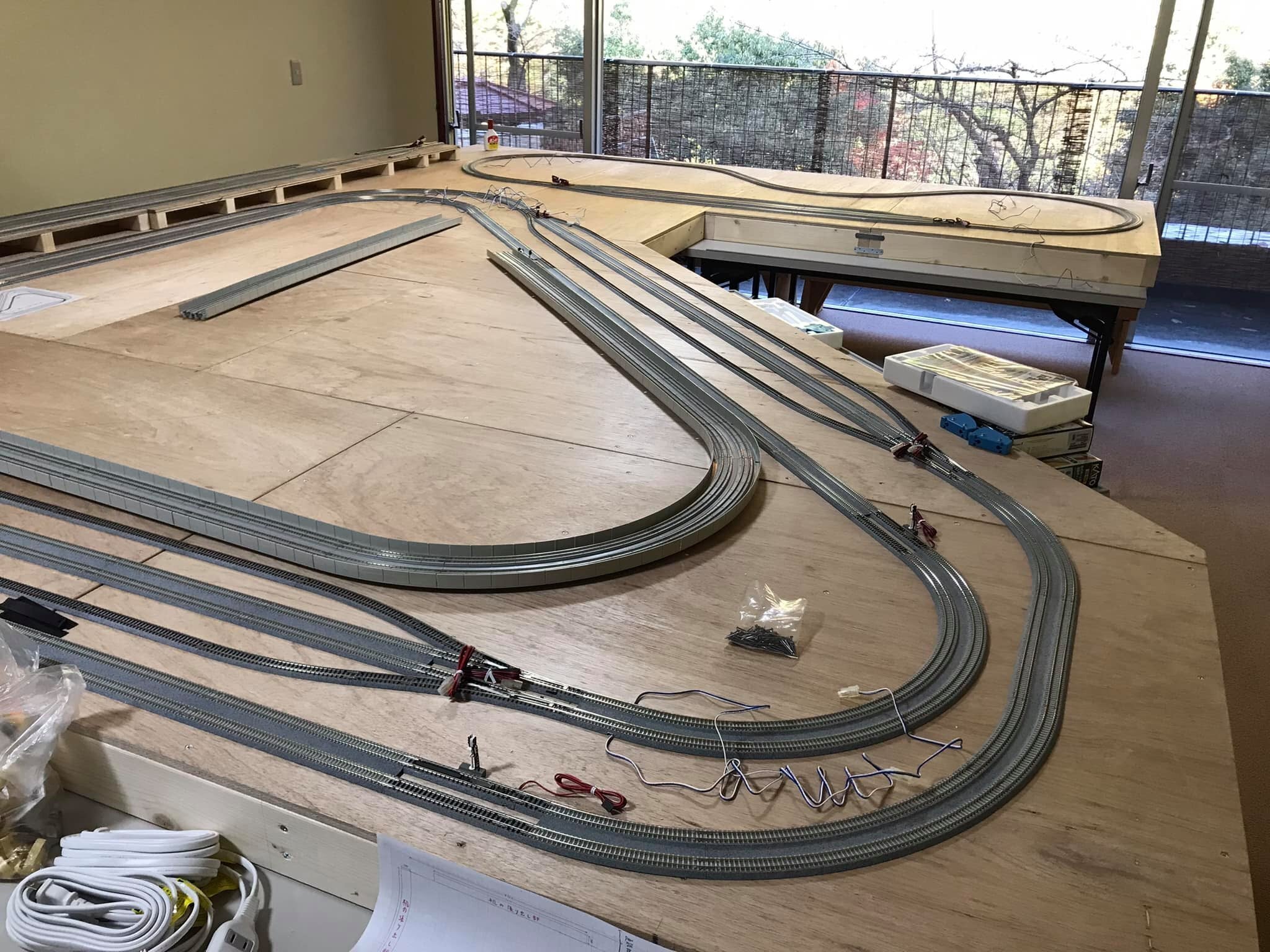 2021/11/13 22:41みなさんこんにちは。ホテル黒部の中島です。コロナ感染数も落ち着き、同時に紅葉のシーズンを迎えて、急にドタバタ忙しくなりました。さて、Nゲージ部屋がここまで出来てきました!11月4日にテーブル、その上に乗せる土台が届きました。11月11日、テーブルをレイアウトに沿って配置転換。そしてその上に重たいコンパネで作った土台を乗せました。11月12日、大工さんと一緒にコンパネ土台を結合。これが大変な作業でした。そして11月13日、いよいよ線路の敷設!一旦、線路を配置してからコンパネに配線のための穴をいくつか開けます。木くずを掃除機で吸い取り再び線路をセット。ようやくホテル黒部鉄道ルームのNゲージ部屋の全容が見えて参りました!ちなみに、おもちゃの鉄道部屋は来週に設営となっております。巨大なレイアウトの様子は、次回にご報告いたします! もっと見る