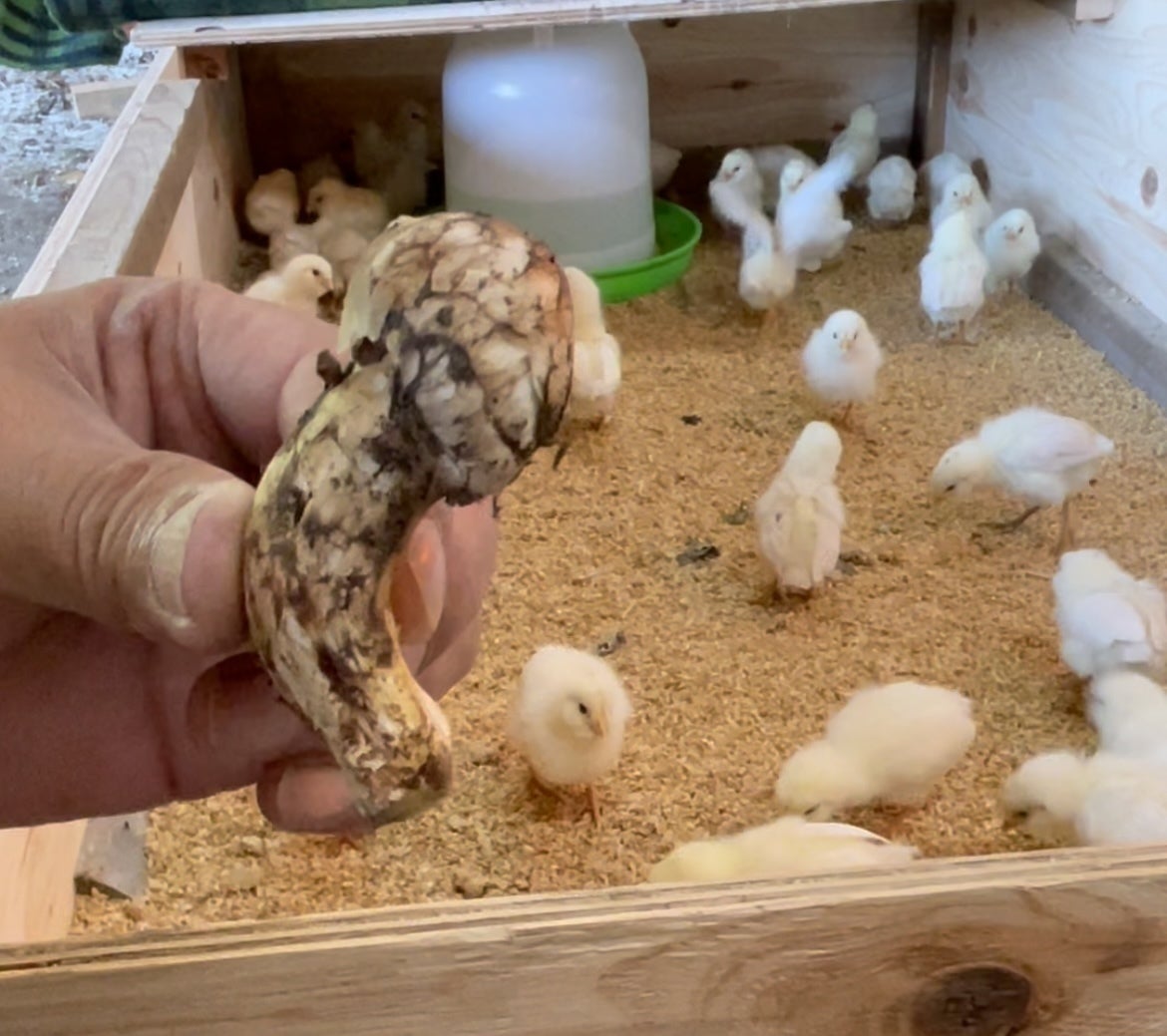 刻んであげた野沢菜を食べる風景康的に育っています。夏は暑い環境で冬は極寒の環境でスクスクと育っています。飼料へのこだわりとしては発酵飼料を与えています。発酵食品が我々人間にも健康的とされるように鶏にも健康的とされています。