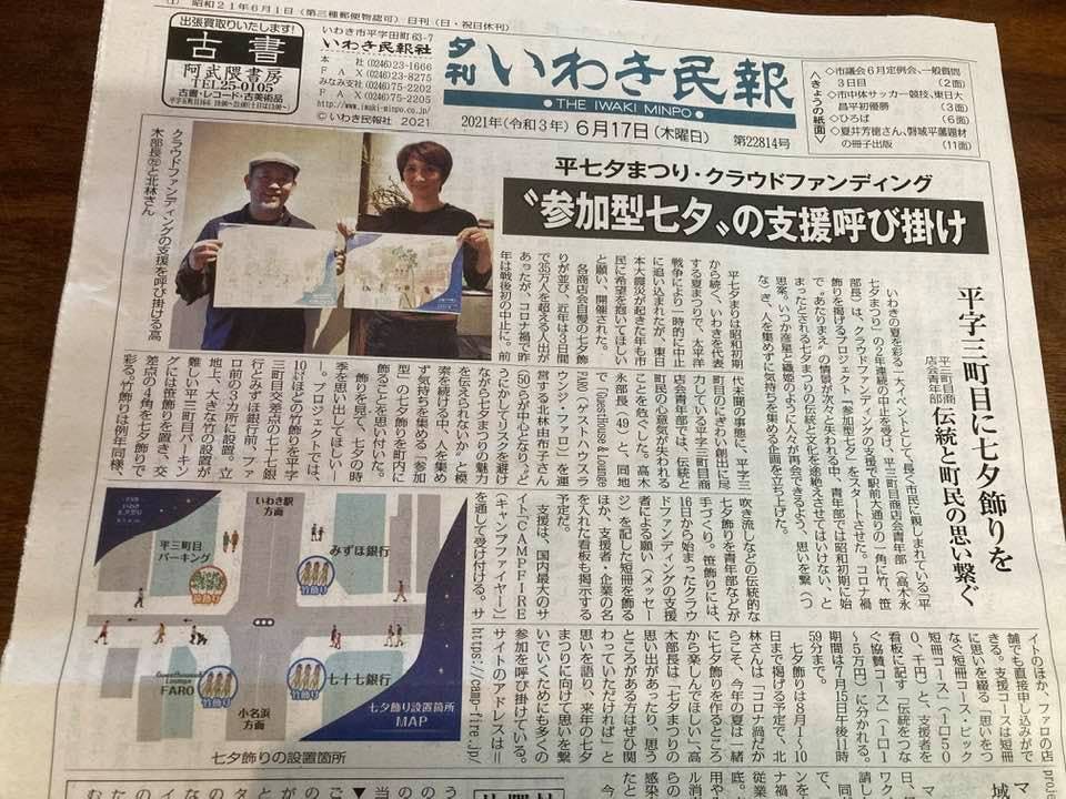 有難いことに、6/17付のいわき民報さんで1面で取り組みをご紹介頂きました。ありがとうございます!!