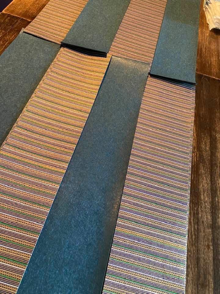 外側には青の2種類の和紙。4枚つなげて1本3メーターの吹き流しにするのですが、今回は同じ和紙ではなく、違う和紙を交互に貼り付けるデザインにしました。(リメイクじゃない他の飾りは違う作り方をしています。こちらもお楽しみに)