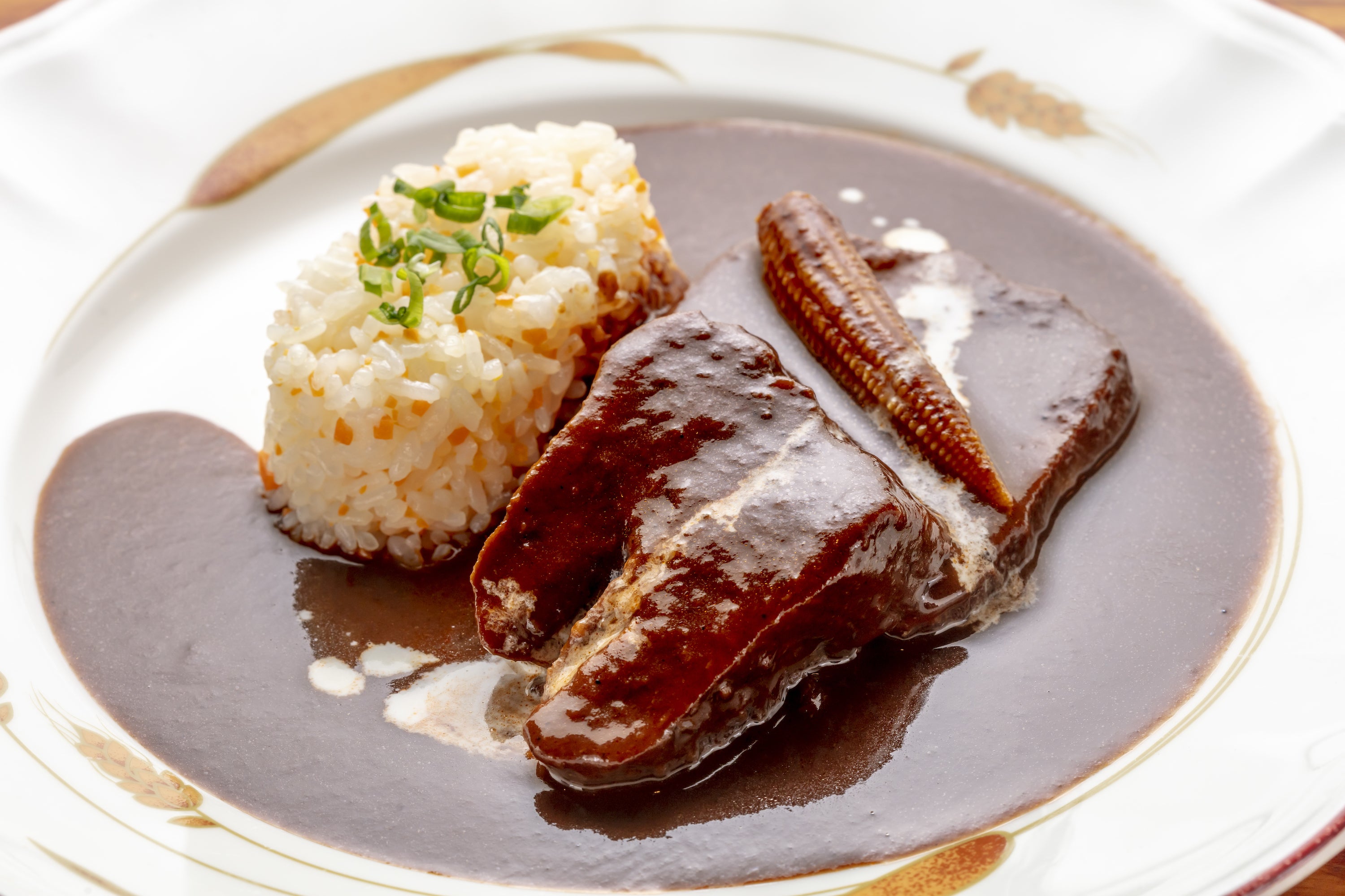 ⑤お皿にバターライスとタンシチューを盛り付け、バターライスには刻んだ小ネギ、タンシチューにはヤングコーンを添えて完成