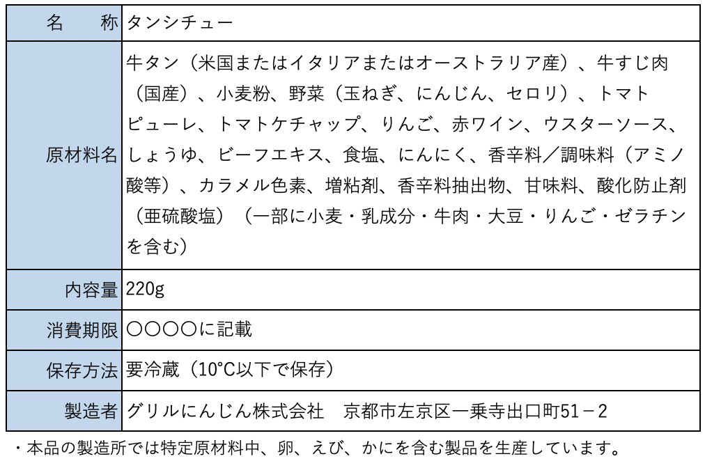 真空調理のタンシチューの食品表示は以下となります。
