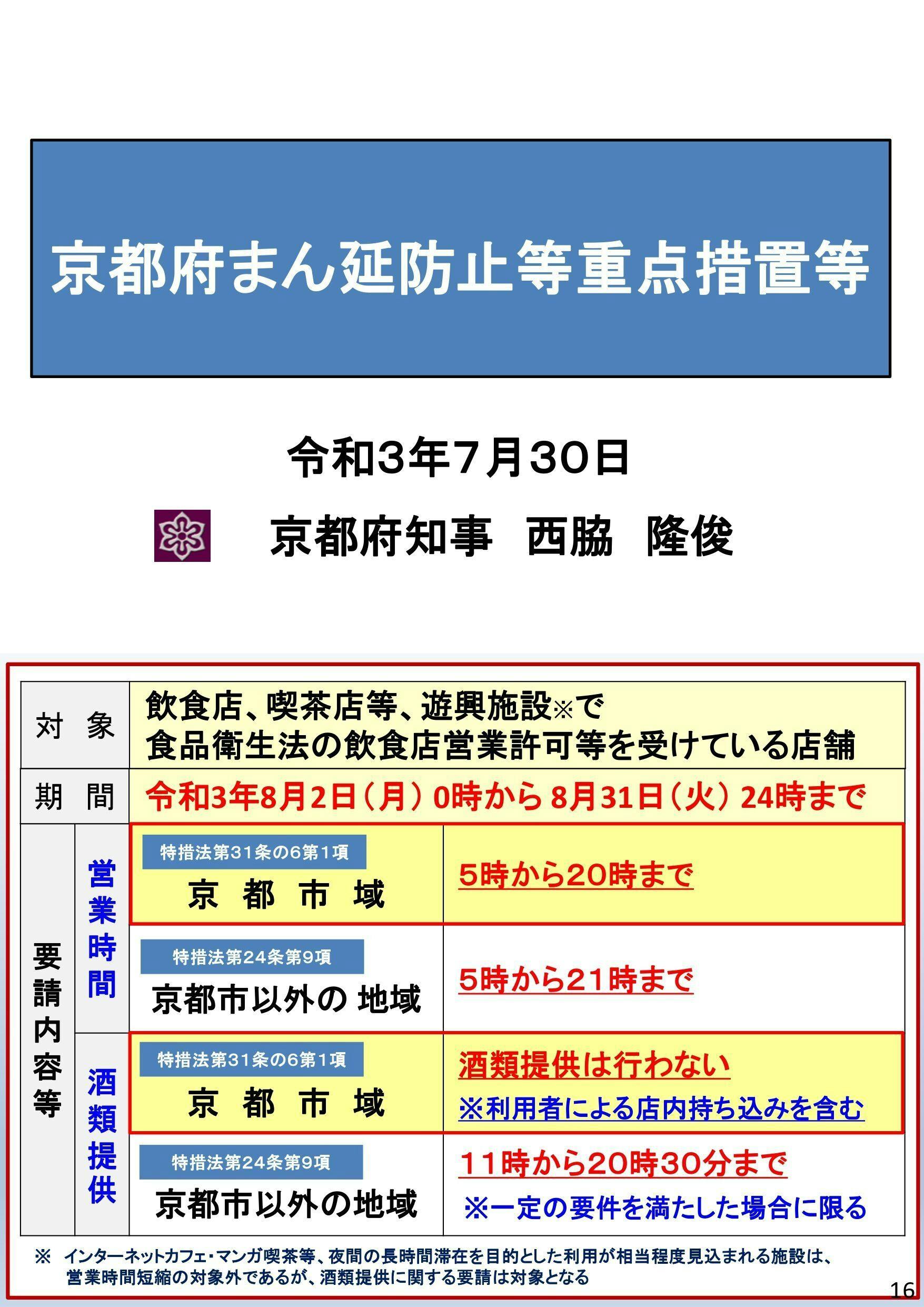 京都市は20時までの飲食店営業に加えてお酒の提供が禁止されております。