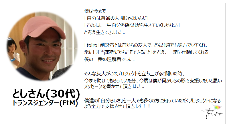 私たち「toiro」は、そのような当事者の存在を身近に感じることができる社会実現の為、活動し続けます。