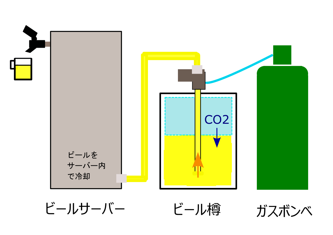 通常のビールサーバーの仕組み。炭酸ガスで押し出します。