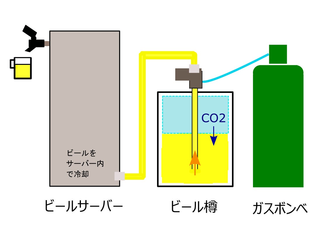 通常のビールサーバーの仕組み。炭酸ガスで押し出します。