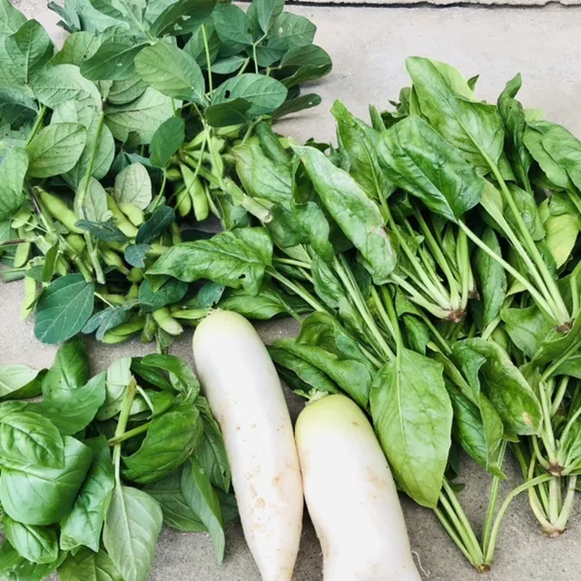 枝豆、ほうれん草、夏大根、バジルが収穫出来ました!
