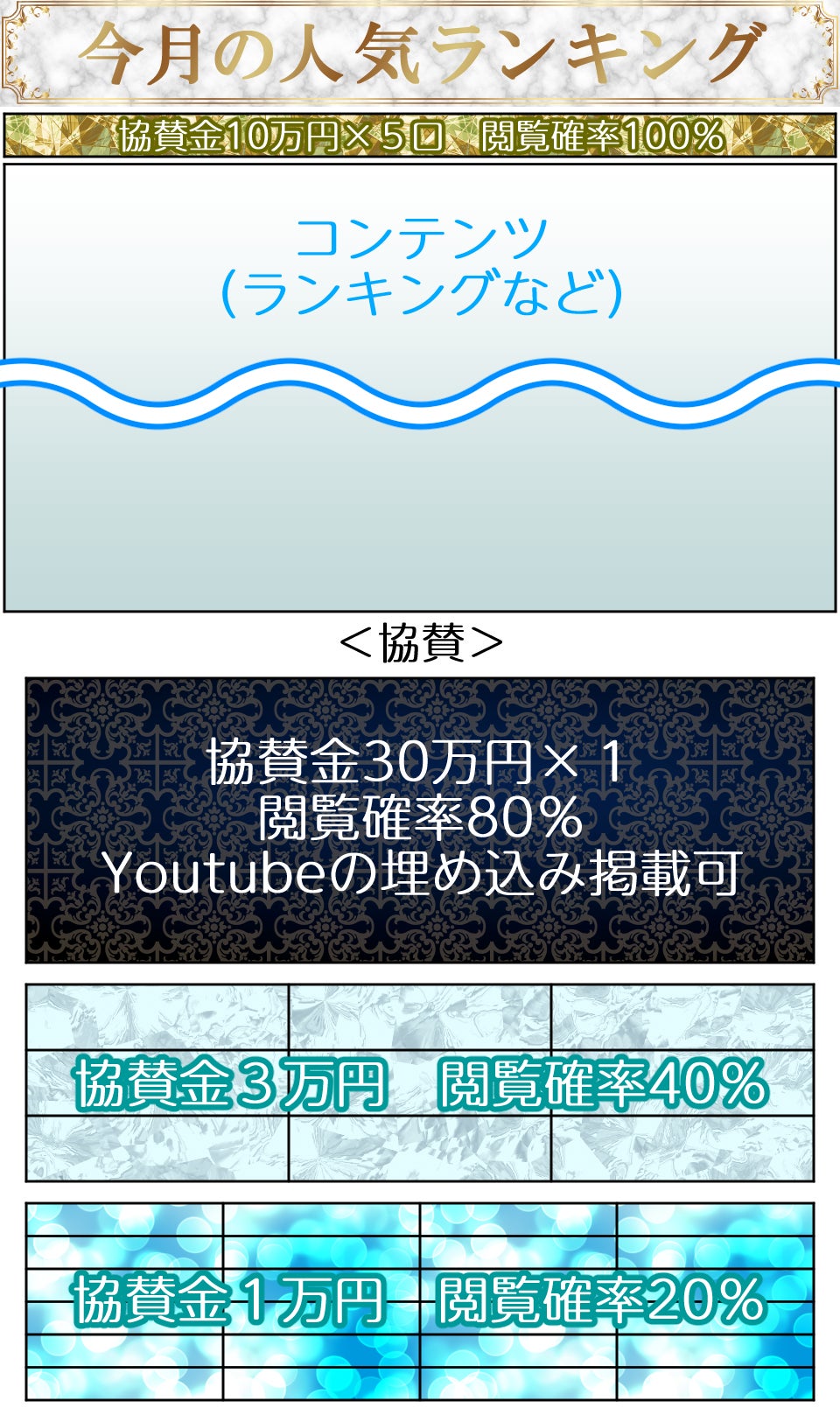 協賛いただいた方は、サイト内のランキングページに6ヵ月間、ご希望の名称やメッセージ、画像を掲載し、リンク先をご指定いただけます。