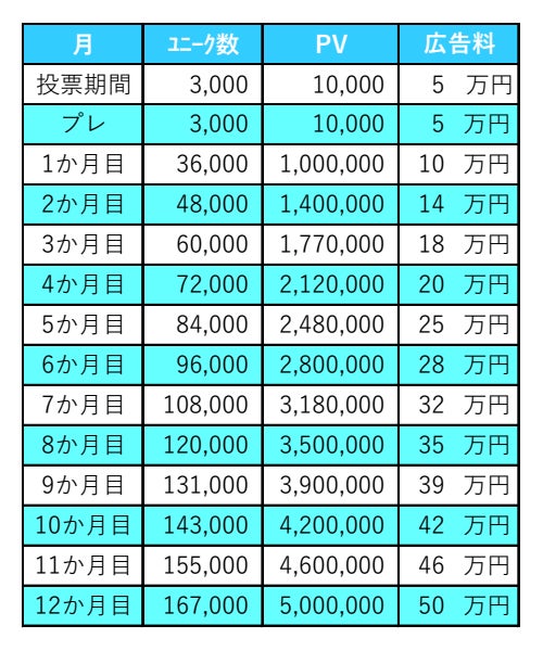 6ヶ月間の予想総PVは、1,200,000PVになります。