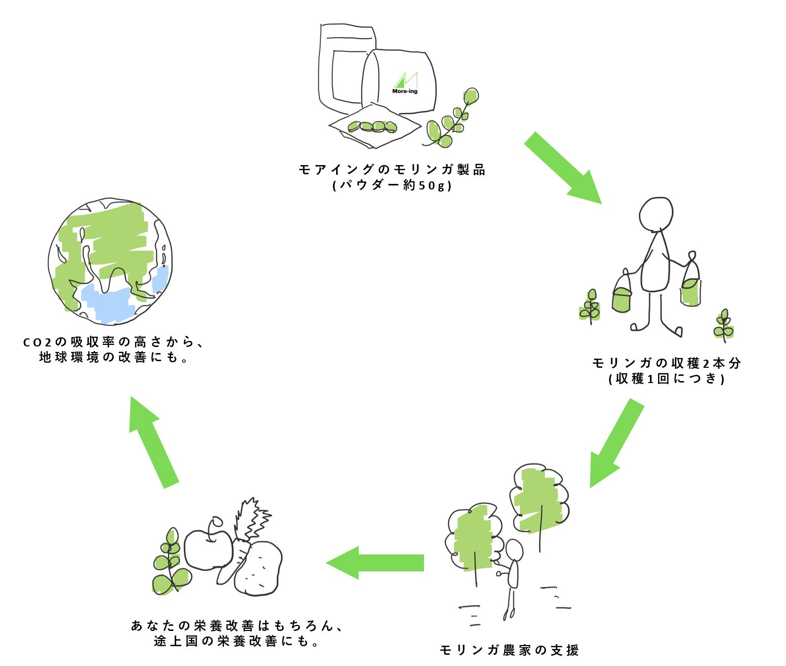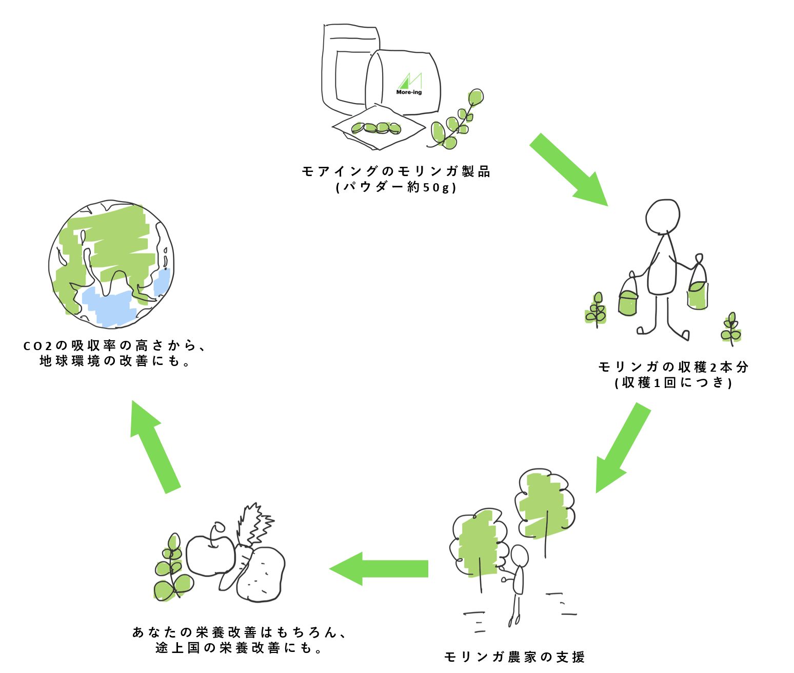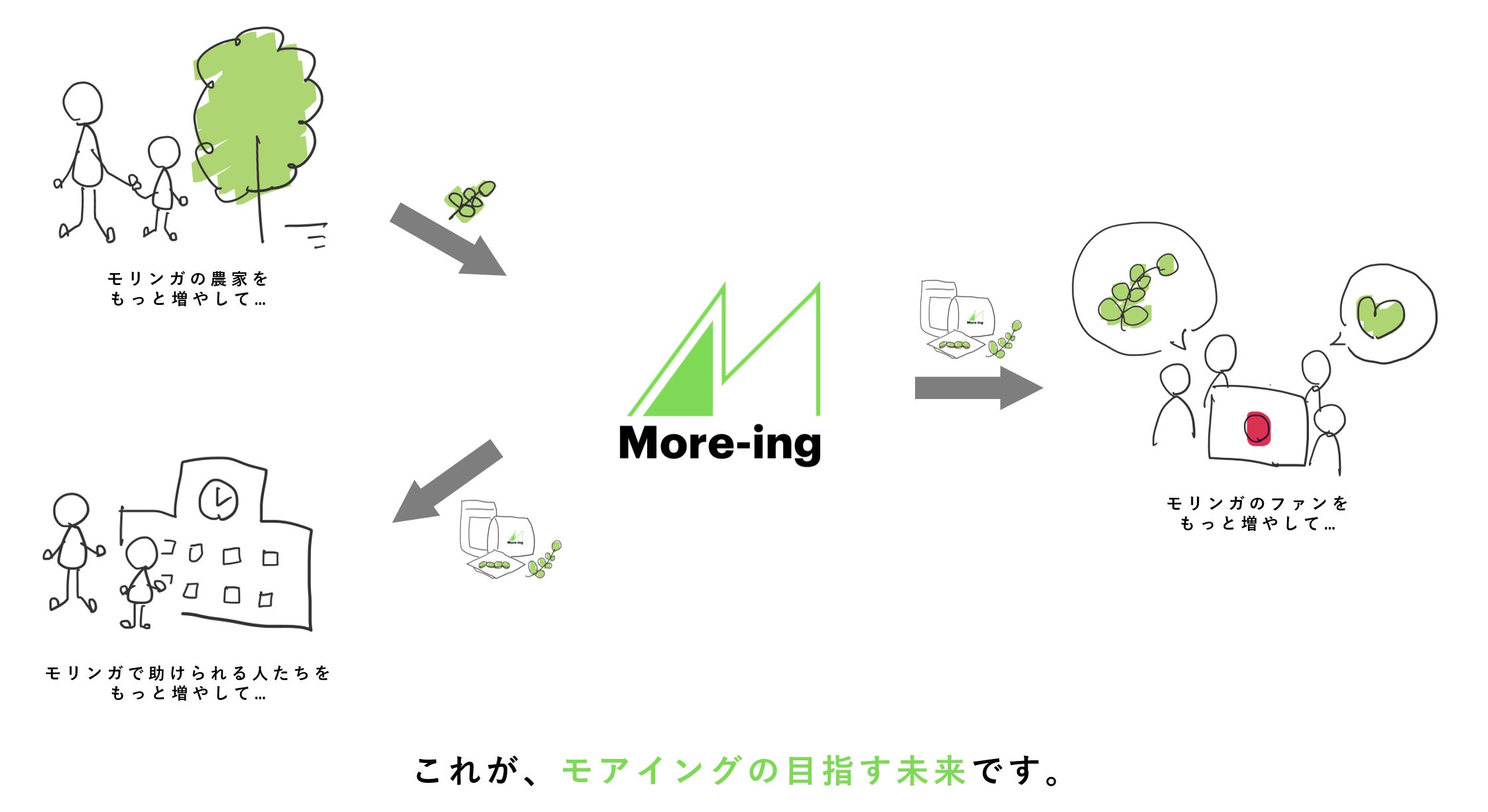 この問題を解決するために、More-ing(モアイング)というプロジェクトが立ち上がりました。モアイングは、モリンガの生産量と消費量を増やすことで、現地の経済状況の改善から栄養状況の改善を目指します。