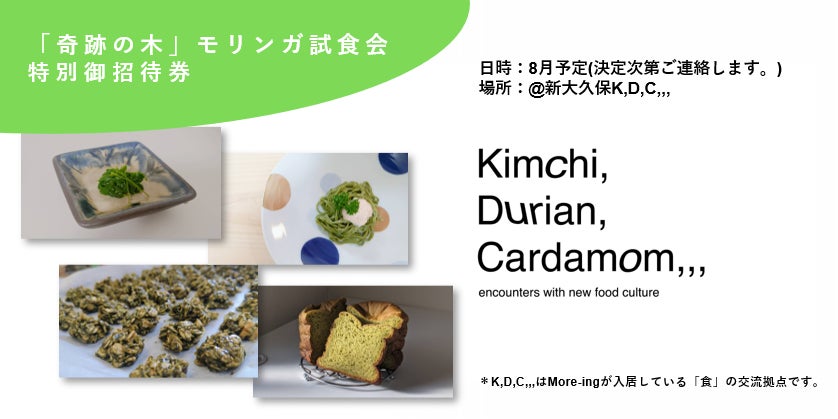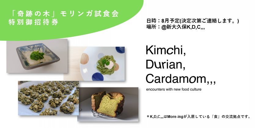 10000円以上ご支援いただいた方には、8月上旬から中旬に新大久保K,D,C,,,***で開催予定の「「奇跡の木」モリンガ試食会@東京」特別御招待券をお送りいたします!