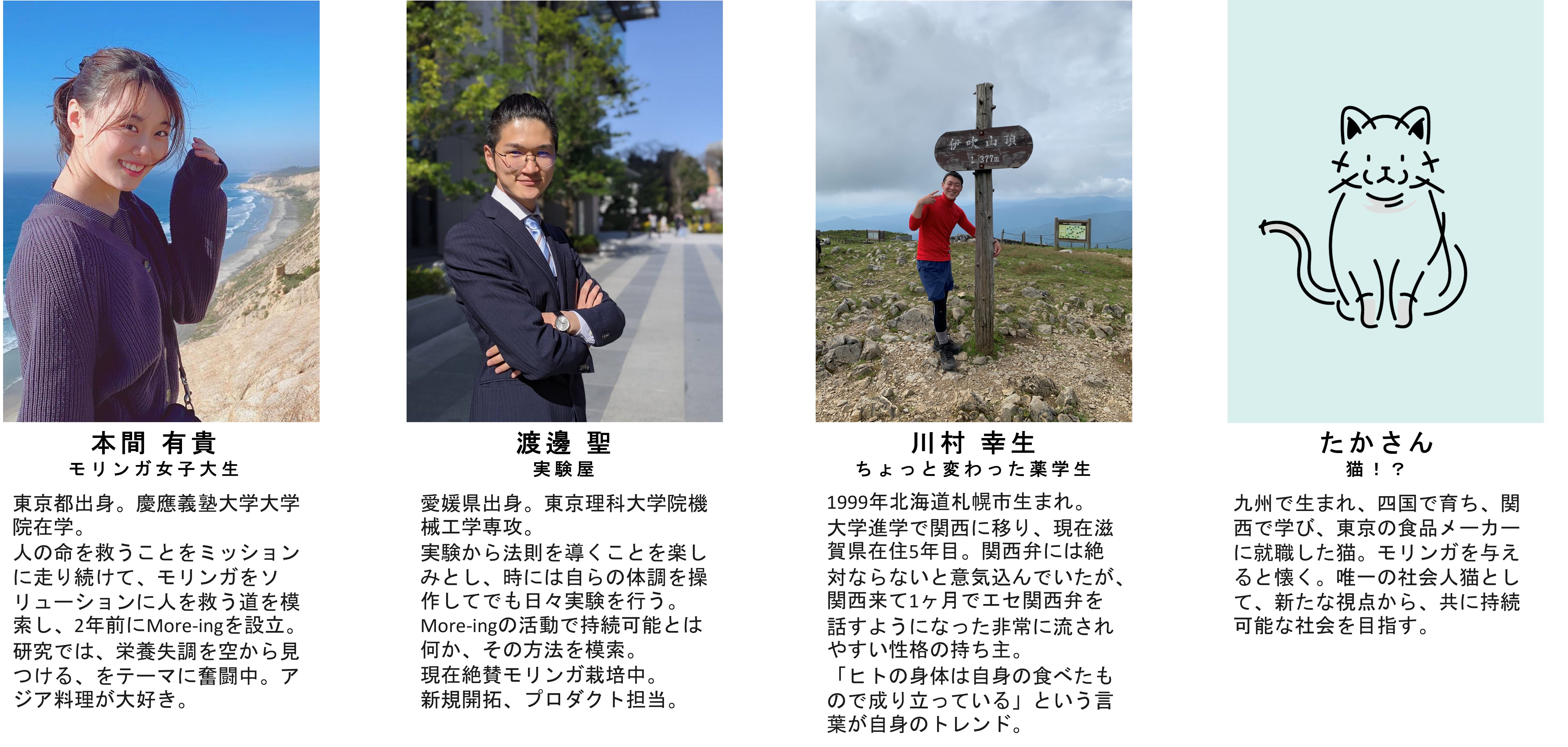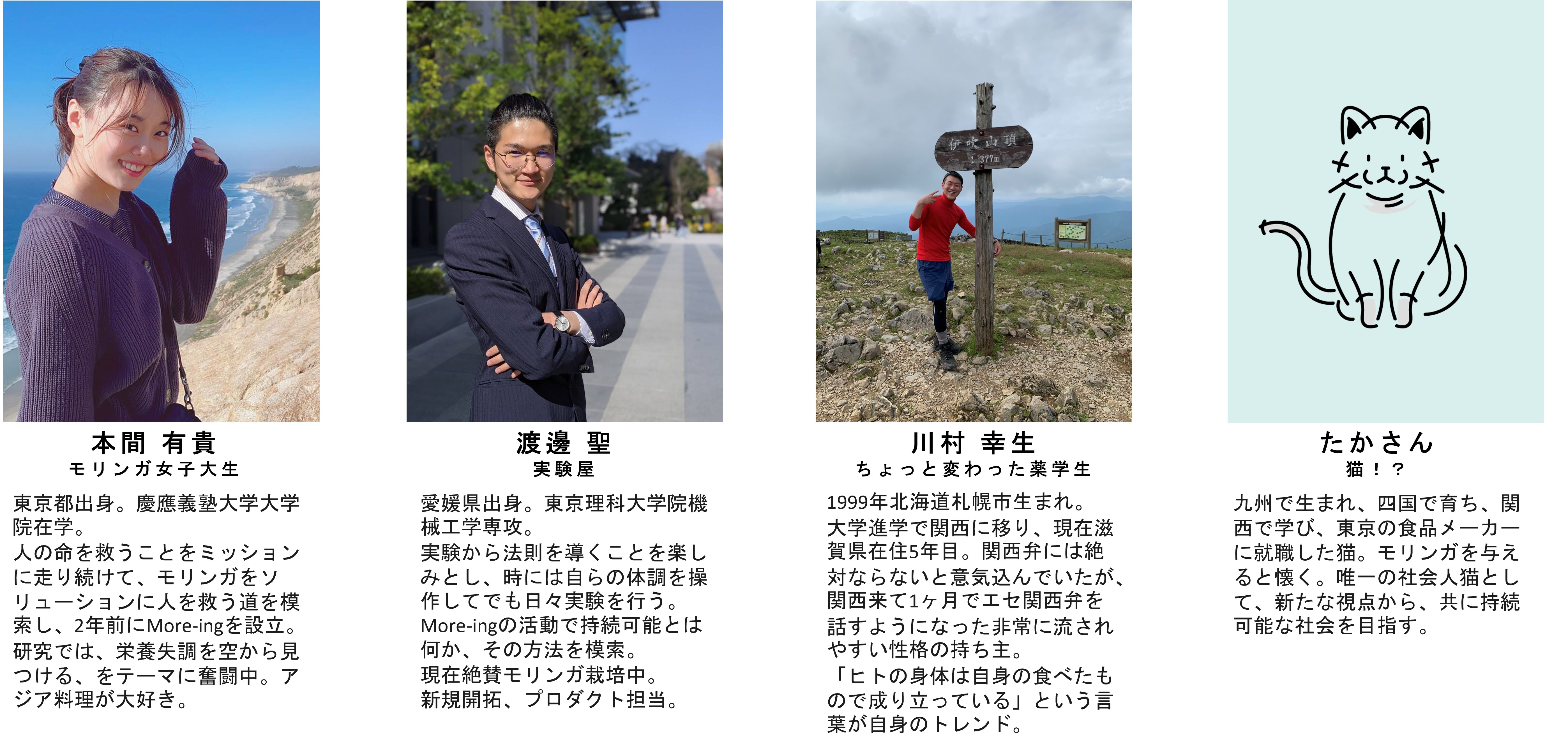 More-ing(モアイング)は、たくさんの世界にある社会課題のなかで、「栄養の状況改善」に重点をおいています。代表者の思いである「若い人の命を持続可能に救う」、この問題を解決する糸口である「奇跡の木」から作る「スーパーフード」。こういった活動が草の根的に広がる、そしてその根源が「日本の若者である」。これを皆で応援しませんか?