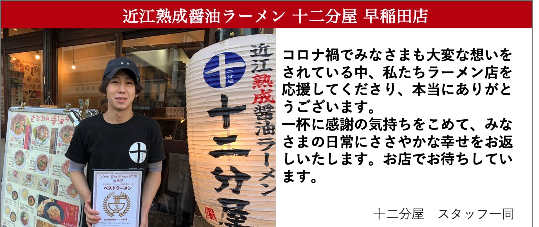 「コロナ禍でみなさまも大変な想いをされている中、私たちラーメン店を応援してくださり、本当にありがとうございます。一杯に感謝の気持ちをこめて、みなさまの日常にささやかな幸せをお返しいたします。お店でお待ちしています。」
