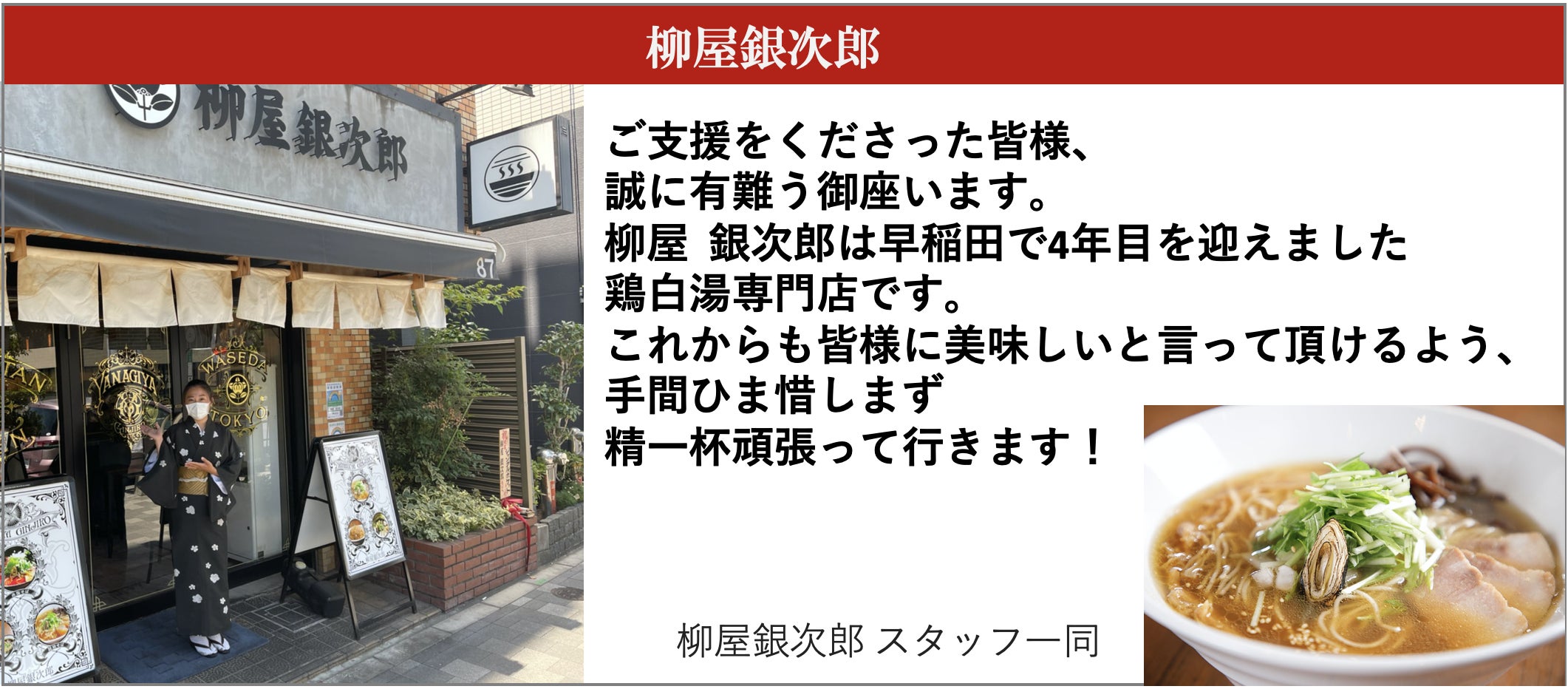 イベント後援いただいている「新宿観光振興協会」様から応援メッセージをいただきました。「高田馬場・早稲田周辺は大学や専門学校も数多く立地し、新宿区内でも特に活気にあふれるエリアです。このエリアで開催される「高田馬場・早稲田ラーメンラリー」は毎年賑わうイベントの1つ。感染防止対策をした安心なお店で、楽しい・おいしい時間をお過ごしください!」新宿観光振興協会 スタッフ一同Facebookでも応援投稿をいただきました。https://www.facebook.com/kanko.shinjuku/残り3日!!厳しい状況が続いていますが、イベント開催に向けて残り数日頑張りますのでよろしくお願いします!実行委員会 一同