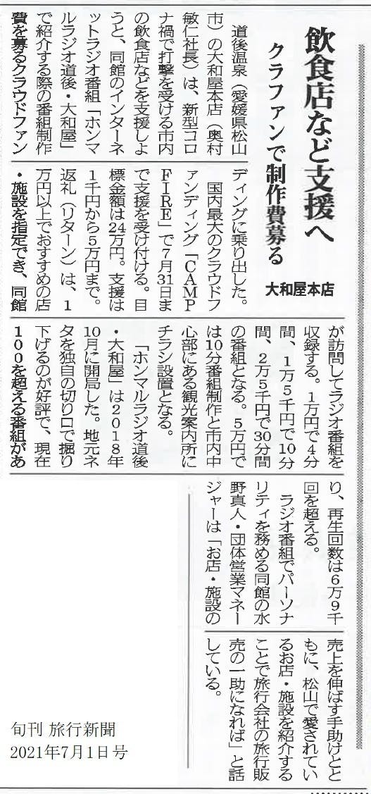 旬刊 旅行新聞様がこのプロジェクトを取り上げてくださいました。松山市の魅力あるお店を紹介することで、松山への観光客の方を増やすことにつながります。