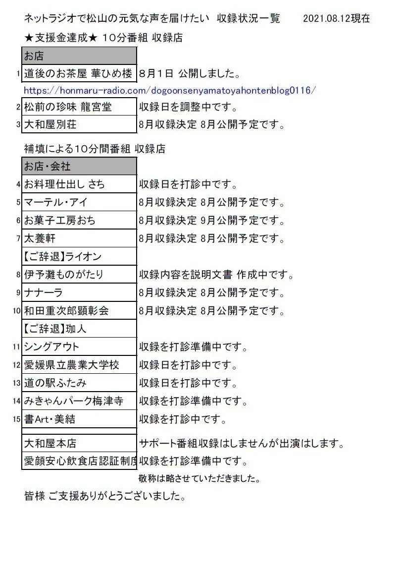 またご支援者様への御礼メールは、8月下旬に送付予定です。