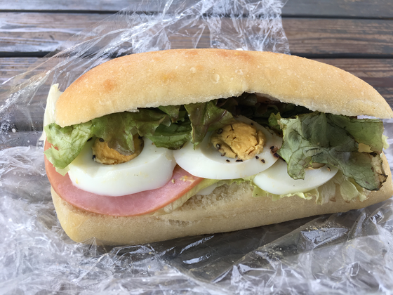 食事パンの(コッペ風に成形した)生地に野菜、ハム、茹で卵にオリーブオイルとのだ塩をかけてオリジナルサンドを作りました。
