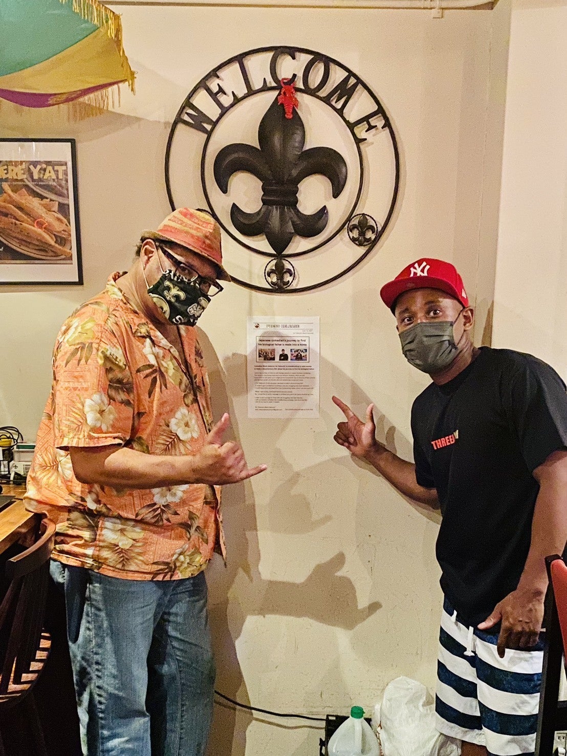 店のトレードマーク、マルディグラ(ニューオリンズの有名なお祭り)の飾りの下にペタっ!!