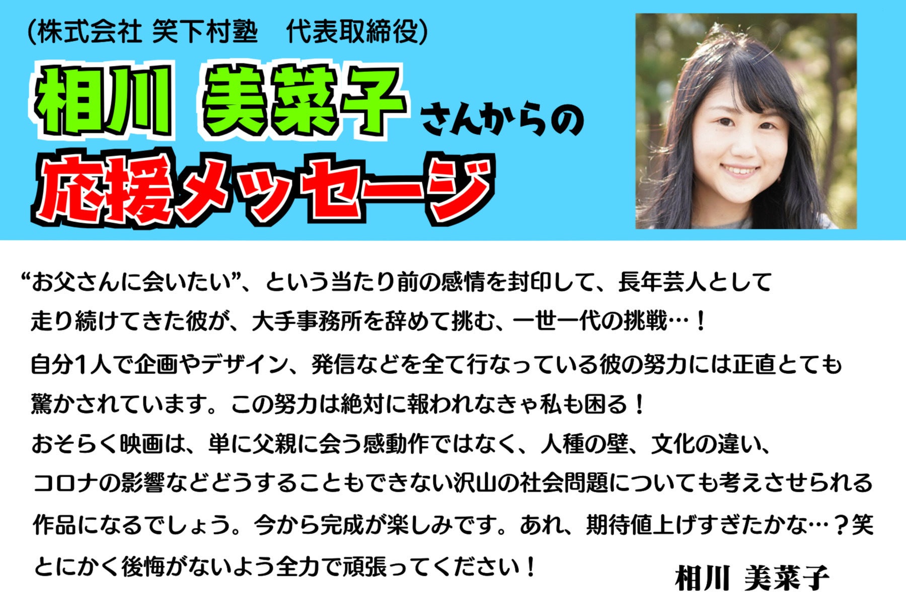 相川社長からクラウドファンディングの応援メッセージを頂きました。