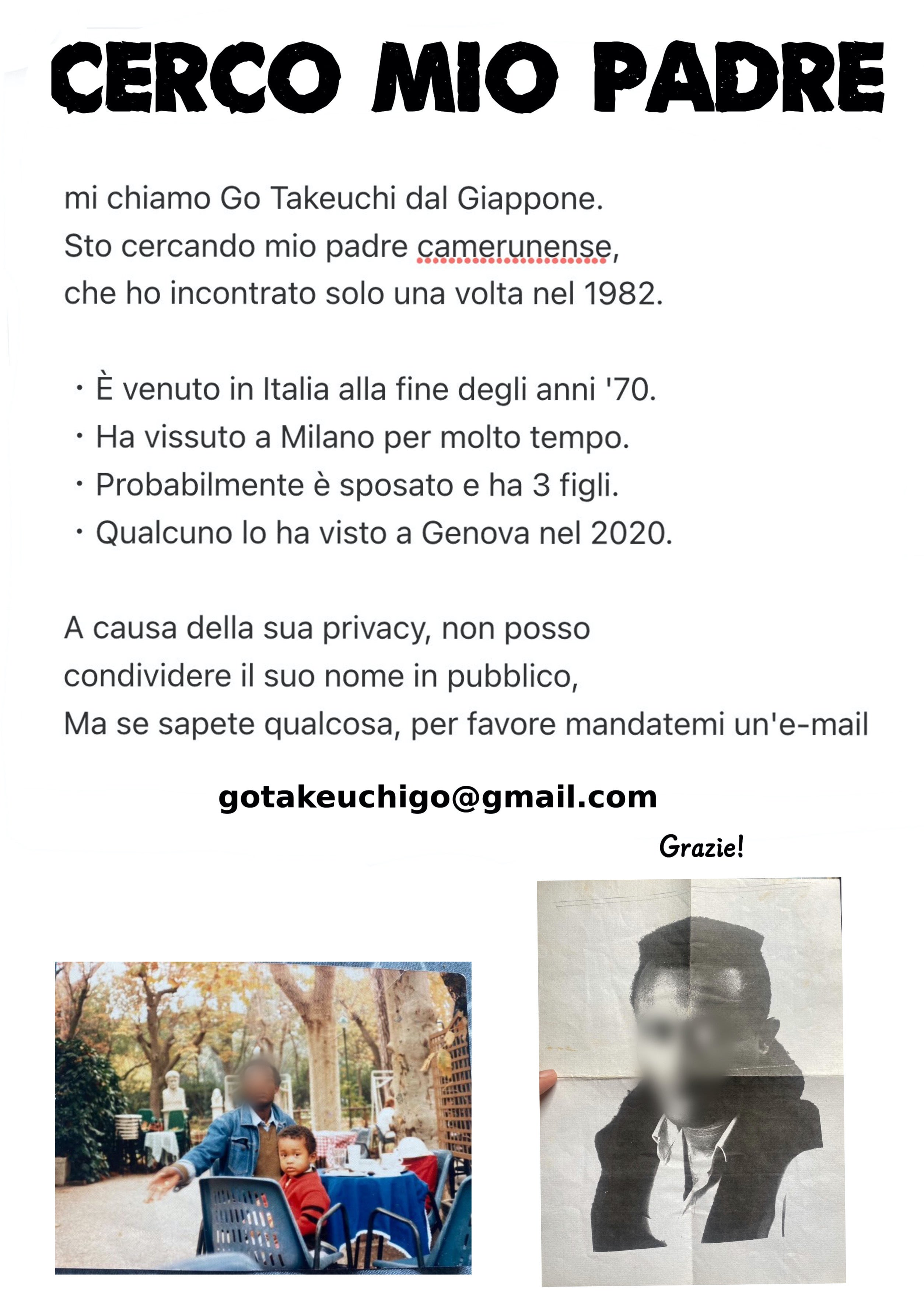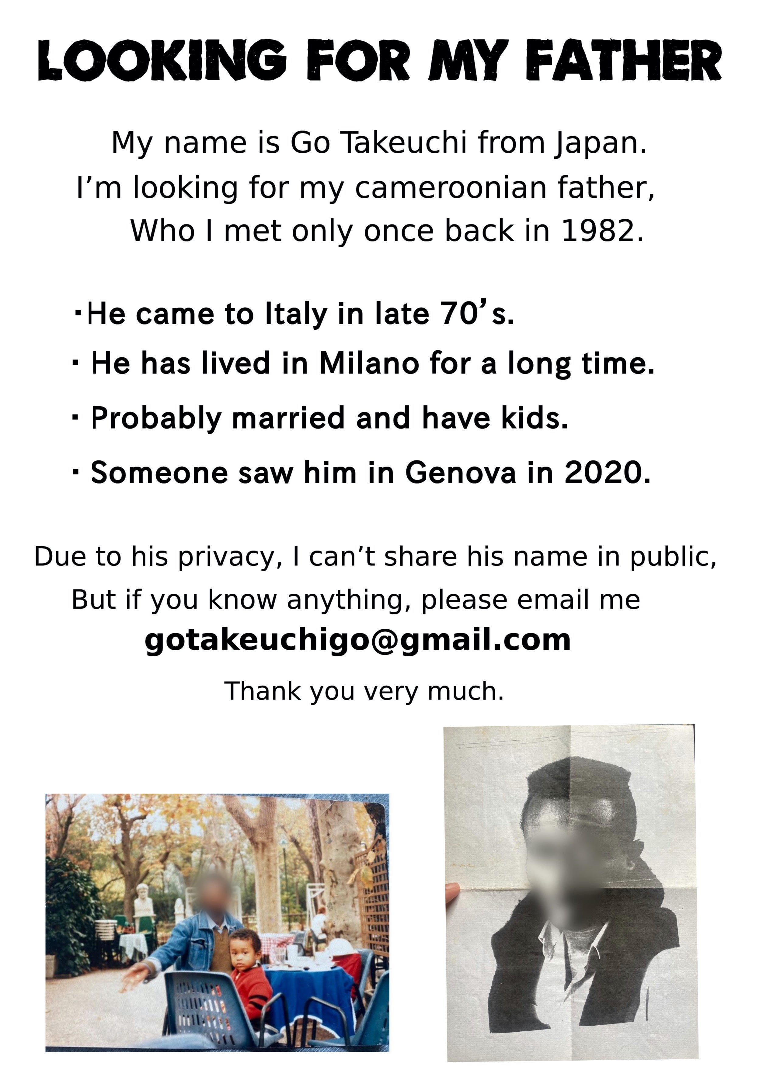 でも父の写真と実名は分かってて、ミラノ在住(40年)のカメルーン人というトコまでは絞れているので、もし皆様の中で"ミラノに住んでるカメルーン人"、"ミラノのカメルーン人コミュニティ"、の知り合いの方がおりましたら、お手数ですが是非僕までDMいただければと思います。
