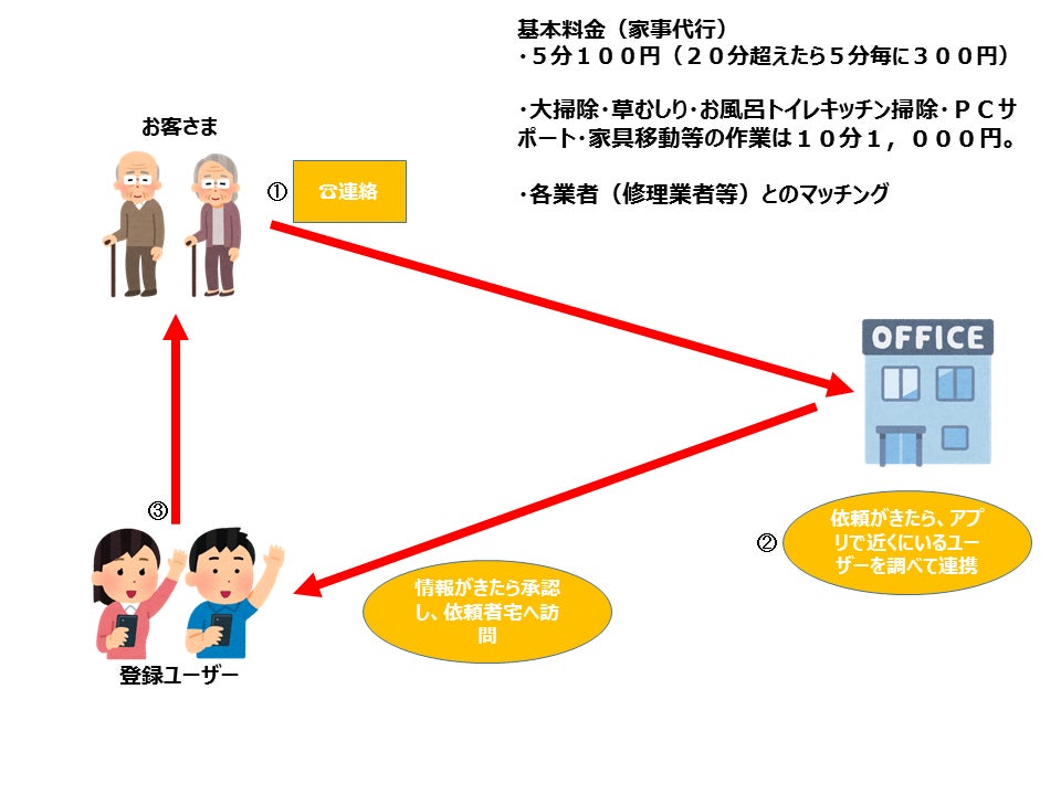 高齢者ユーザー様からお問い合わせをいただきましたら、作成するアプリでお手伝いユーザー様の位置情報を確認し、近くにいるお手伝いユーザー様に情報連携し訪問していただく。