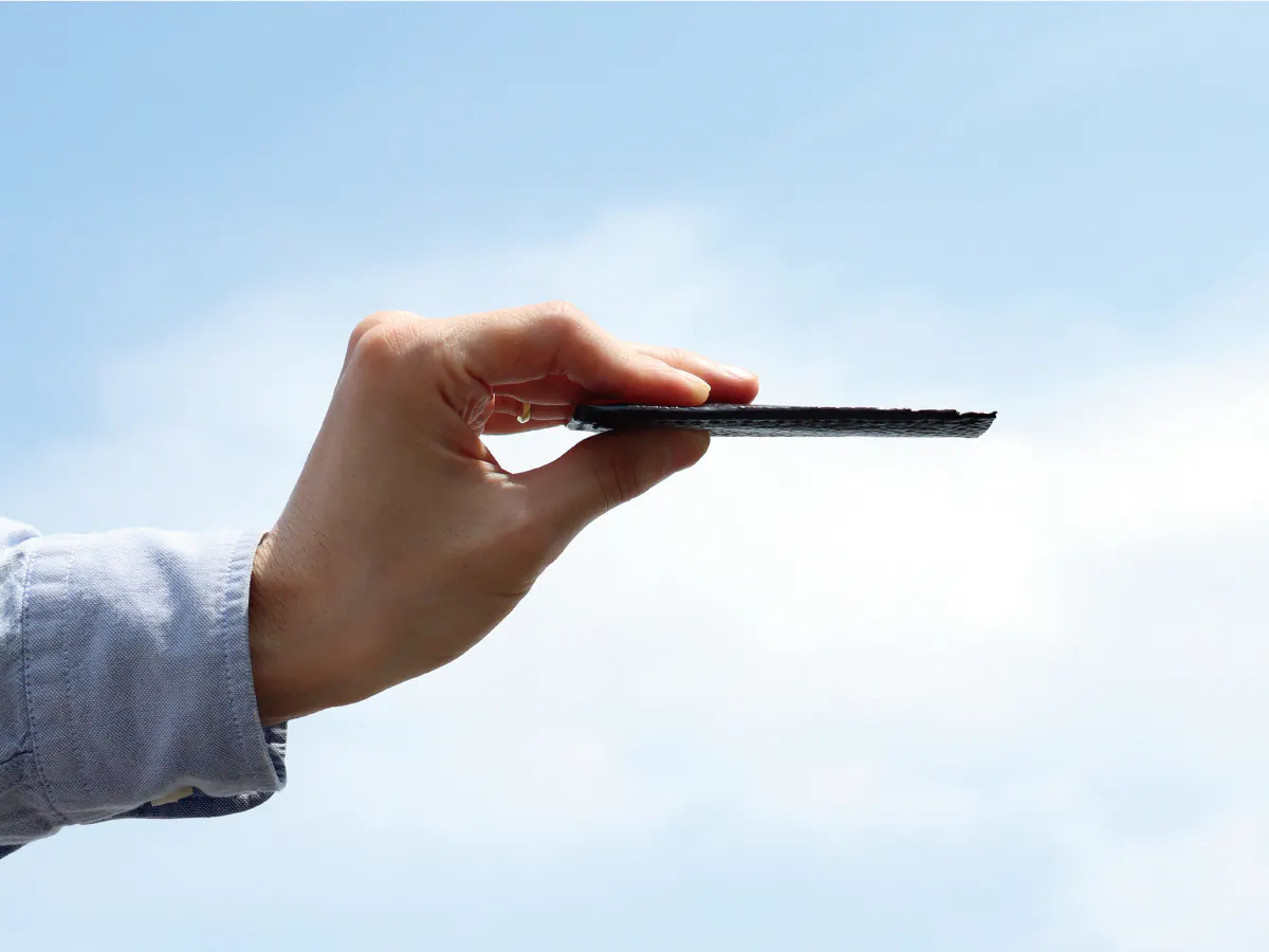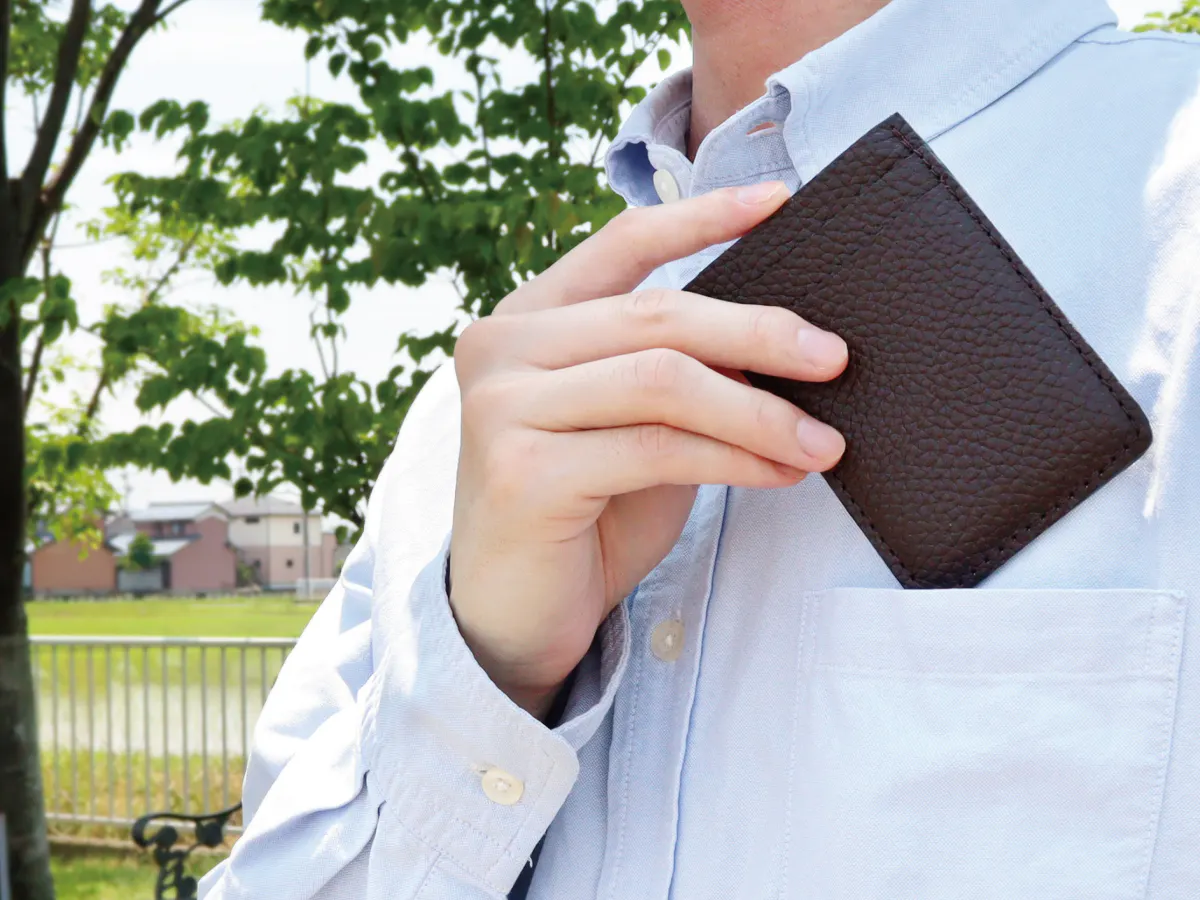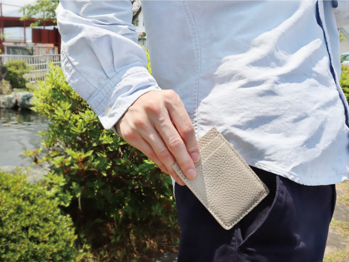 スーツの内ポケットやパンツの前ポケットに入れてもシルエットが崩れない、薄型デザイン。