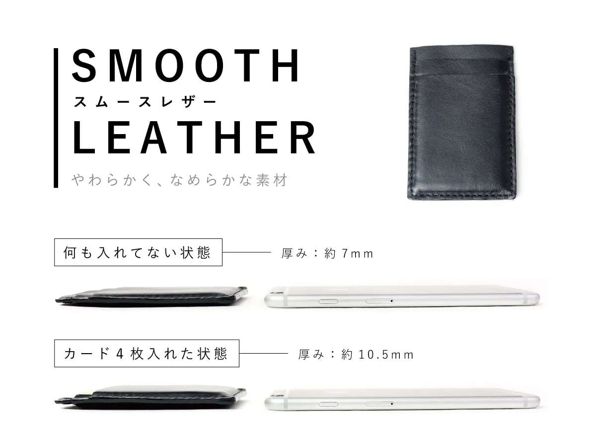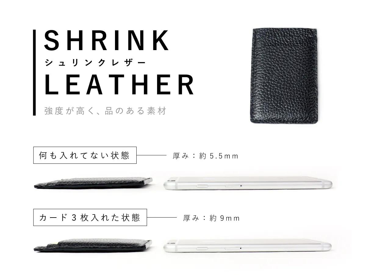 シュリンクレザーカードケースは最大でカード3枚、スムースレザーカードケースは最大でカード4枚入ります!カードを入れても厚みは約1㎝!