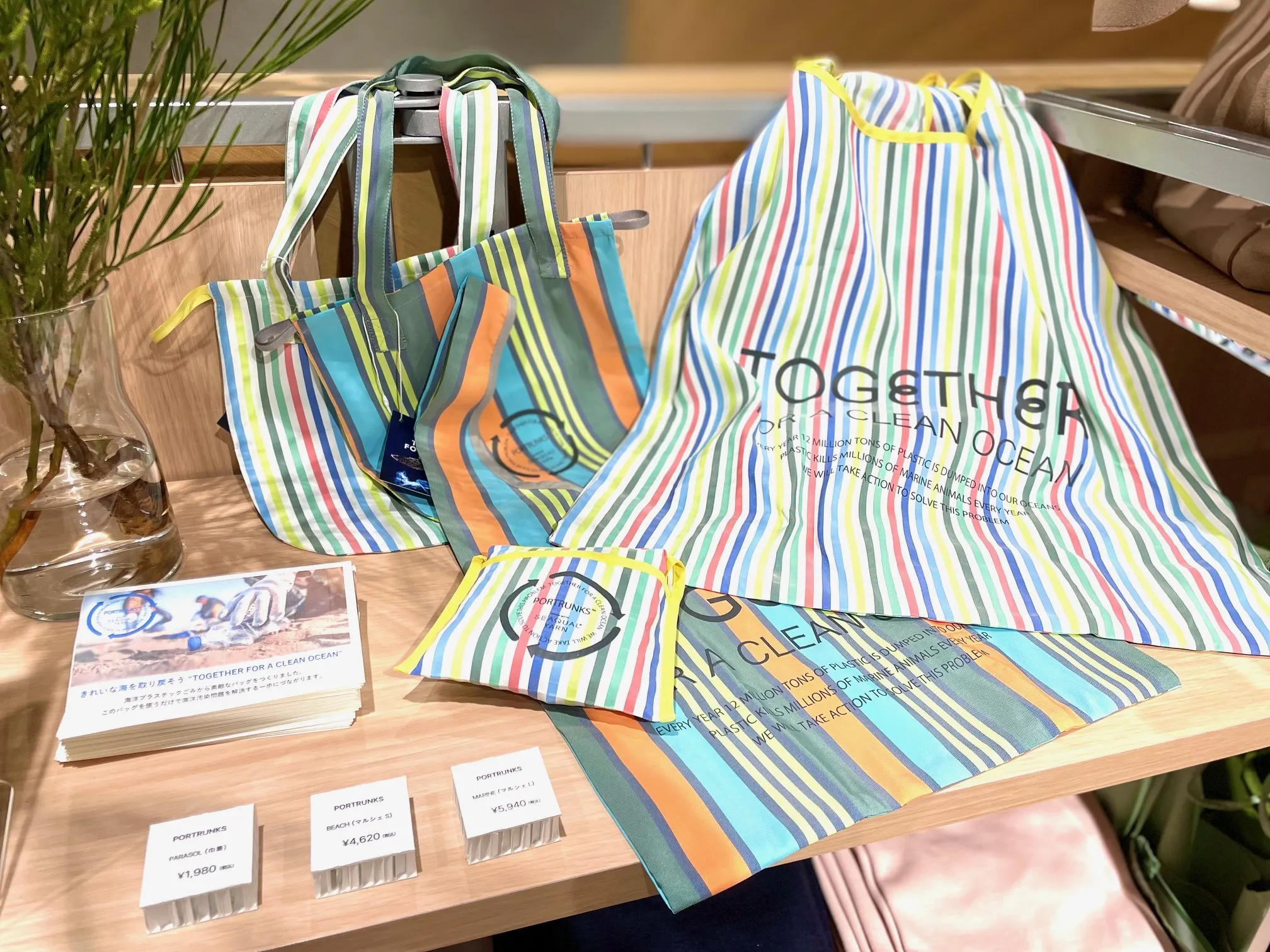 実は[Cosme Kittchen] さんのユニフォームは[PORTRUNKS]と同じ生地なんです。そう海洋プラスチックリサイクル素材「SEAQUAL」です。