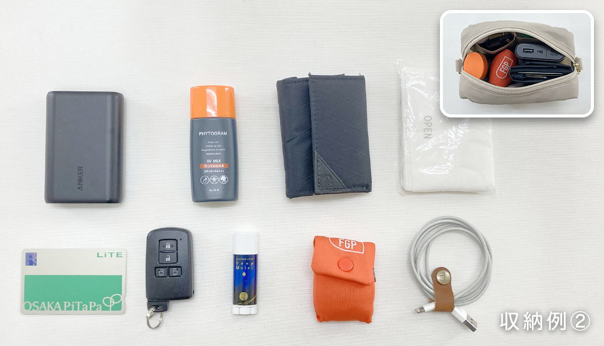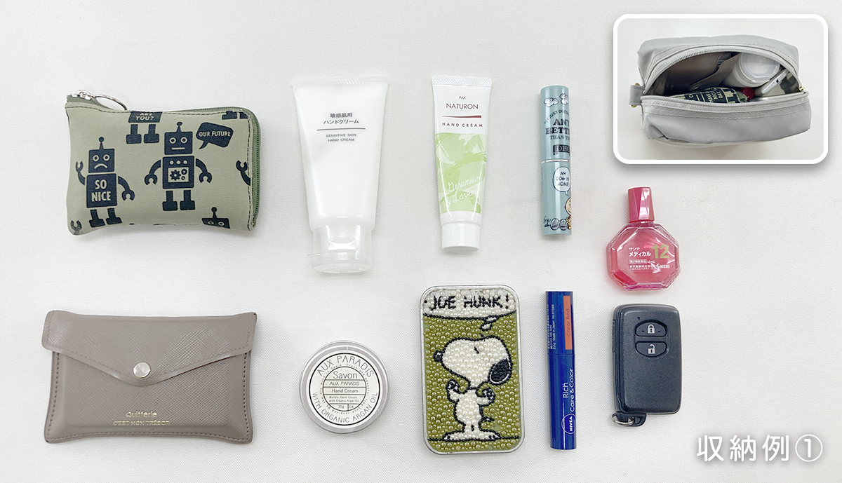 スマートフォン、(コンパクト)財布、イヤホン、鍵、マスク、リップ、ハンカチ、日焼け止め、ハンドクリーム、コンパクトエコバッグ、充電ケーブル、モバイルバッテリー、メモ帳とペンなどの中からあなたが日常よく使用するものを丸ごとMottetteに収納できます。
