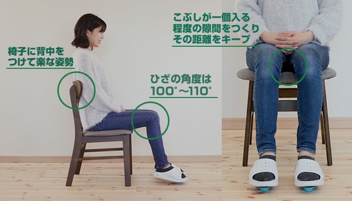 ②ナガラボにしっかりと足を入れ固定し、ヒザの角度を100~110°に広げます。