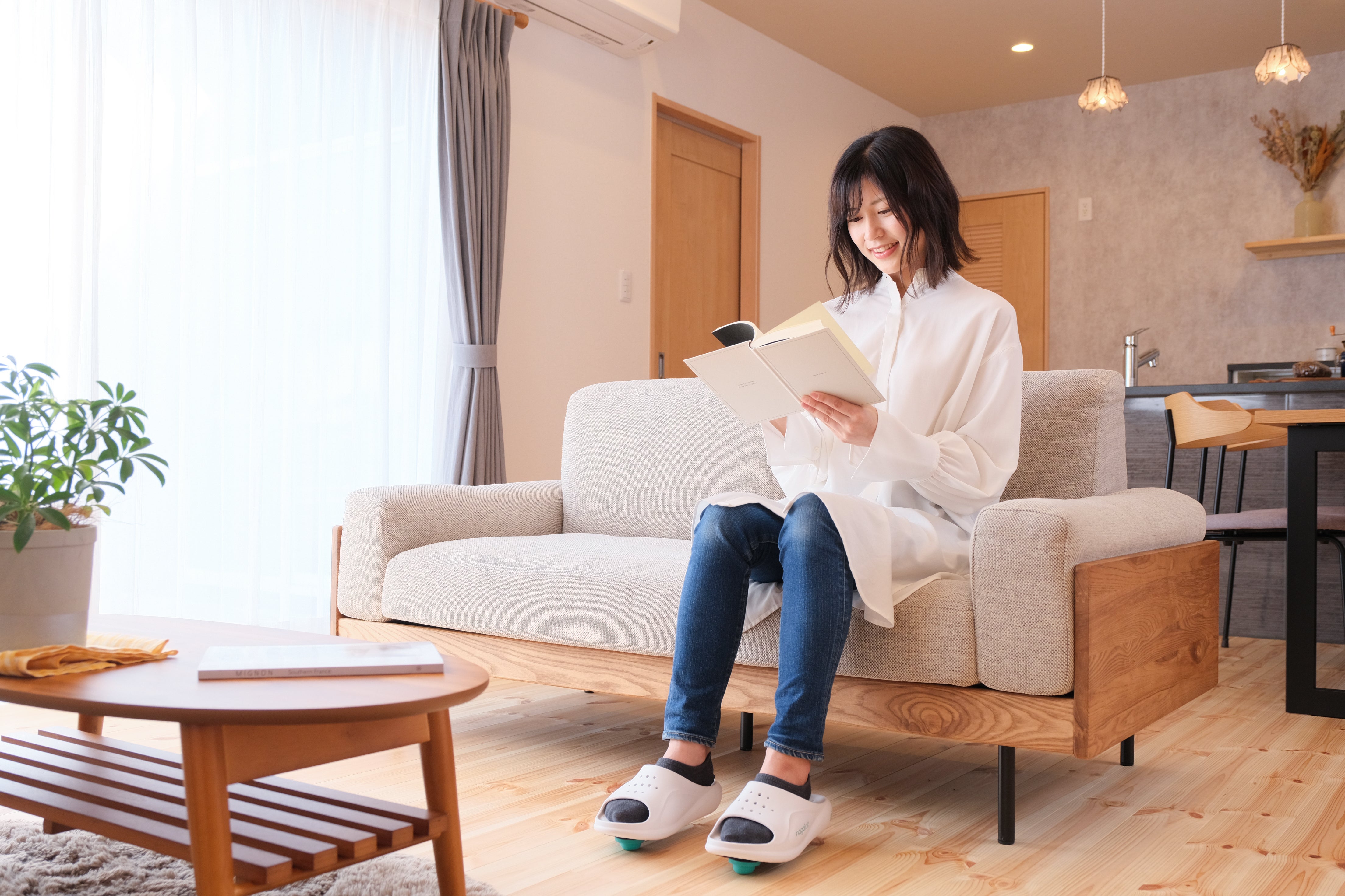 「安全・安心・健康。新たなライフスタイルを足元から提案」を掲げ、日々の商品開発をおこなっている私たち広島化成シューズ事業本部では、ステイホームにより増加した「室内で椅子に座っている時間」を利用して、簡単に運動効果を得ることができる履物を提供することができないかと考え、商品化へ向けた取り組みをスタートしました。