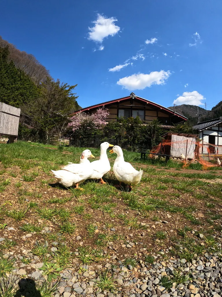 敷地内でアヒルや烏骨鶏が自由に遊ぶ姿は、来館者の心を和ませる。