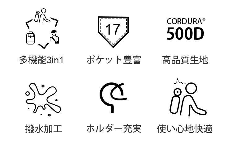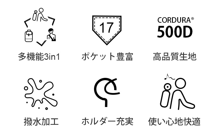 そして使う人に応じた3in1設計。充実の17ポケット(リュック本体は11ポケット)で、キャンプ用品はもちろん、15インチのラップトップも収納できるポケットを設けているので、自然に囲まれて仕事をしたい方も満足の仕様です。