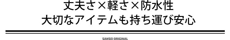 本製品の一番のこだわりは生地の品質。ほかにはないCORDURA®×TPUラミネートの生地が、あなたのアイテムを雨と衝撃から守ります。背面やショルダーベルトの高クッション性パッド。