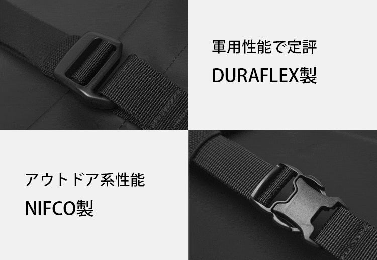 リュックのロールアップ部に採用されているバックルは、軍用バックルも手掛けていたタフ性抜群のDURAFLEX製を採用。
