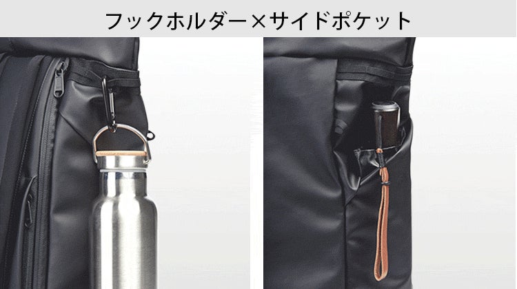 折り畳み傘や給水用ボトルはサイドポケットに。35cm以内のものならジャストフィットで収納できます。