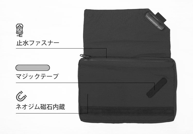 大口のメインコンパートメントはネオジム磁石が内蔵。ジッパータイプならではのファスナー破損や、うっかり閉め忘れてしまうなどのトラブルとも無縁なので、ストレスなくお使いいただけます。