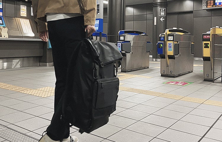 混み合う電車やバス内では、リュックをおろして持ち手を活用。丈夫な設計なのでフックにも掛けられ、置き場にも困りません。