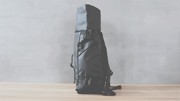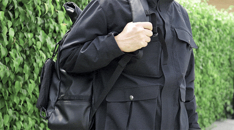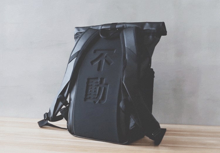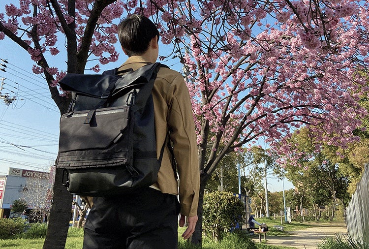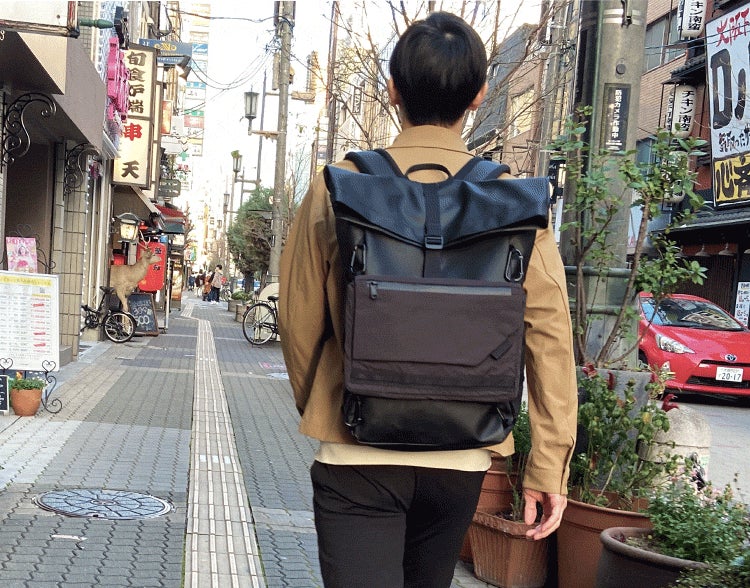 3in1リュック『不動』は、リュック(容量21~26L)とメッセンジャーバッグ(約2L)が一体化した新感覚モデル。ごちゃつきがちなリュックも、フロント部のメッセンジャーバッグには小物、リュックにはサイズの大きな荷物を、と収納がシンプルに。