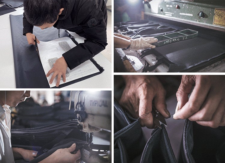 生地の生産はCORDURA®の糸を生地にするところから始まり、染色加工やコーティング加工を経て、ホットプレスによってTPUとCORDURA®生地が一体化、すべての工程で約60日間かけて完成します。あなたの安心を支えるため、糸の密度から異なる素材の配分まで考え抜かれて生産しております。