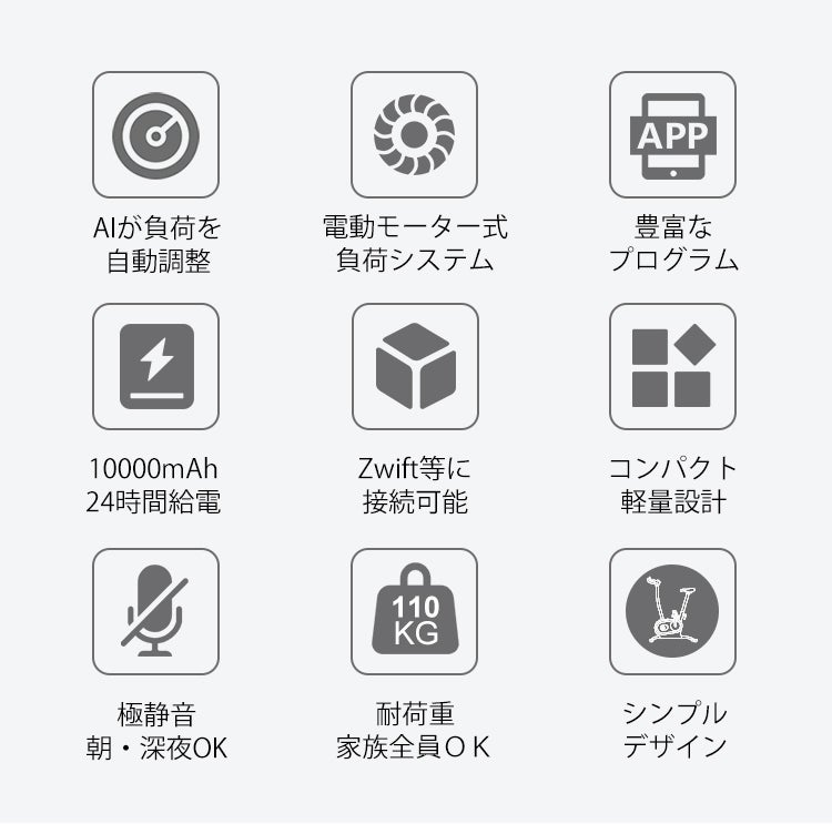 新技術「電動モーター式」の負荷で動くのでペダルを回しても非常に静かです。早朝・深夜でも、ちょっと動きたいなと思った時はいつでも家族や隣の部屋の人を気にせず思いっきりのトレーニングに打ち込めます。