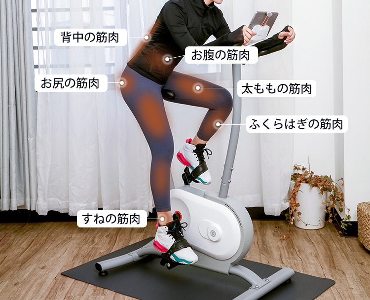 アップライトタイプは普段乗り慣れた自転車に近く、自然な姿勢でペダルを漕ぐため体への負担が少ないのが嬉しいです。また上半身でバランスをとるので、脚への負荷だけでなく体幹を使って全身にアプローチできるところも嬉しいです。