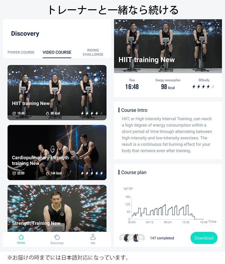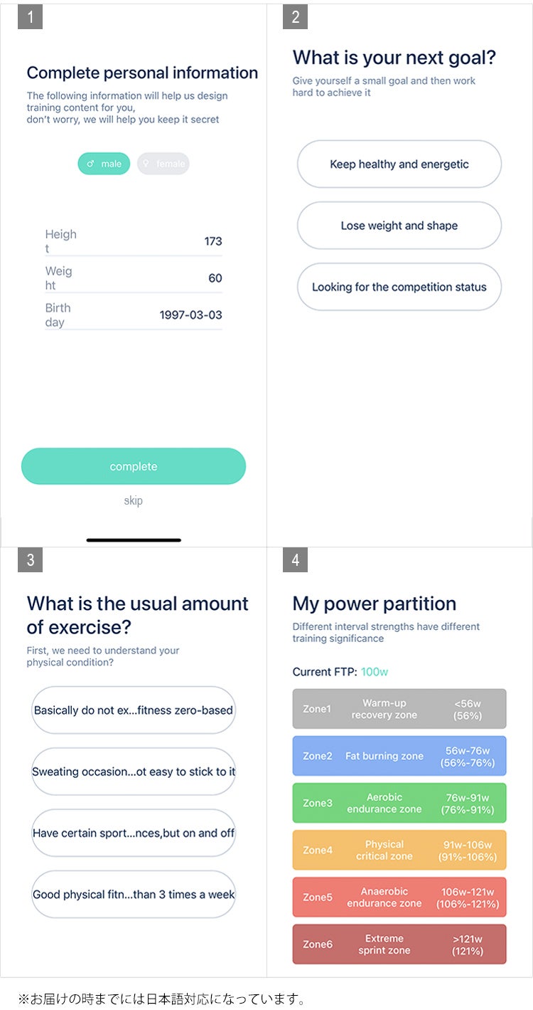 アプリにログインすると、FTPテストといういくつかの質問が出されます。それによってトレーニング(Power)のブログラムがあなたの体力に合わせたものにカスタマイズされます。キツすぎて続かない、弱すぎて物足りないということができるだけ起こらないようにしました。さらにアプリで一人一人アカウントを作れるため、1台あれば家族みんなでそれぞれの記録をつけてお使いいただくことができます!