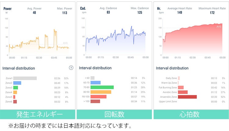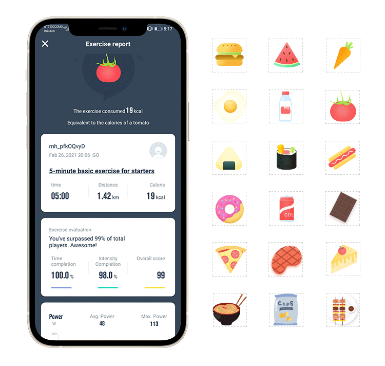 ひとつのメニューが終わった後には運動時間・走行距離・消費カロリー、発生エネルギー、回転数、心拍数など詳細なデータが記録されます。消費したカロリーは食べ物で表示されたり、面白くて分かりやすいです。運動による体力の向上がグラフで分かるので、やる気がどんどん湧いてきますよ!