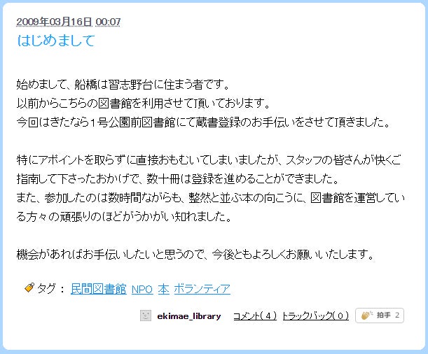 2009/2/11の図書館オープン後は、地元の方がボランティアに参加してくれてブログも書いていただいたようです。当時の記事がググったら出てきました。
