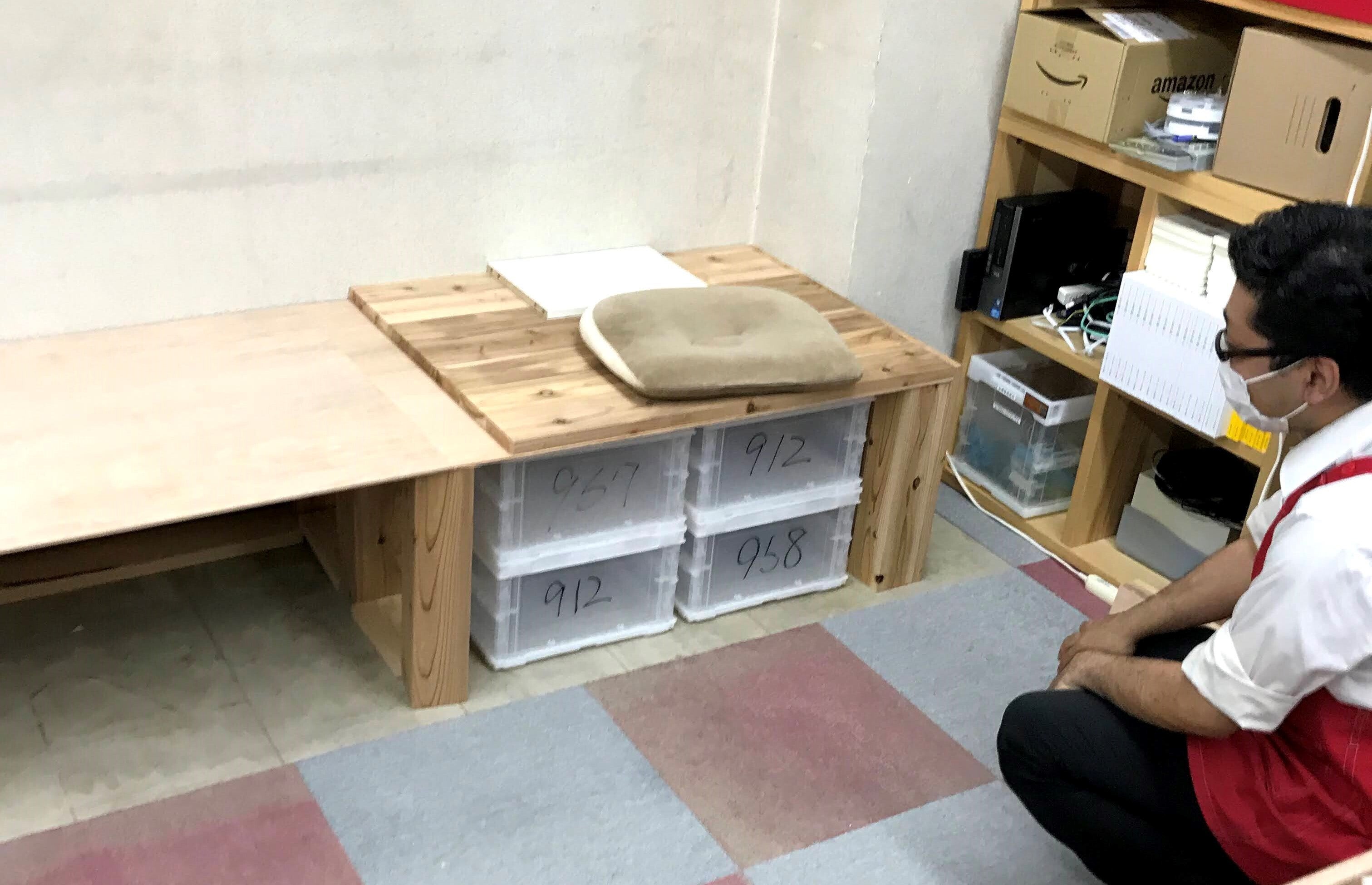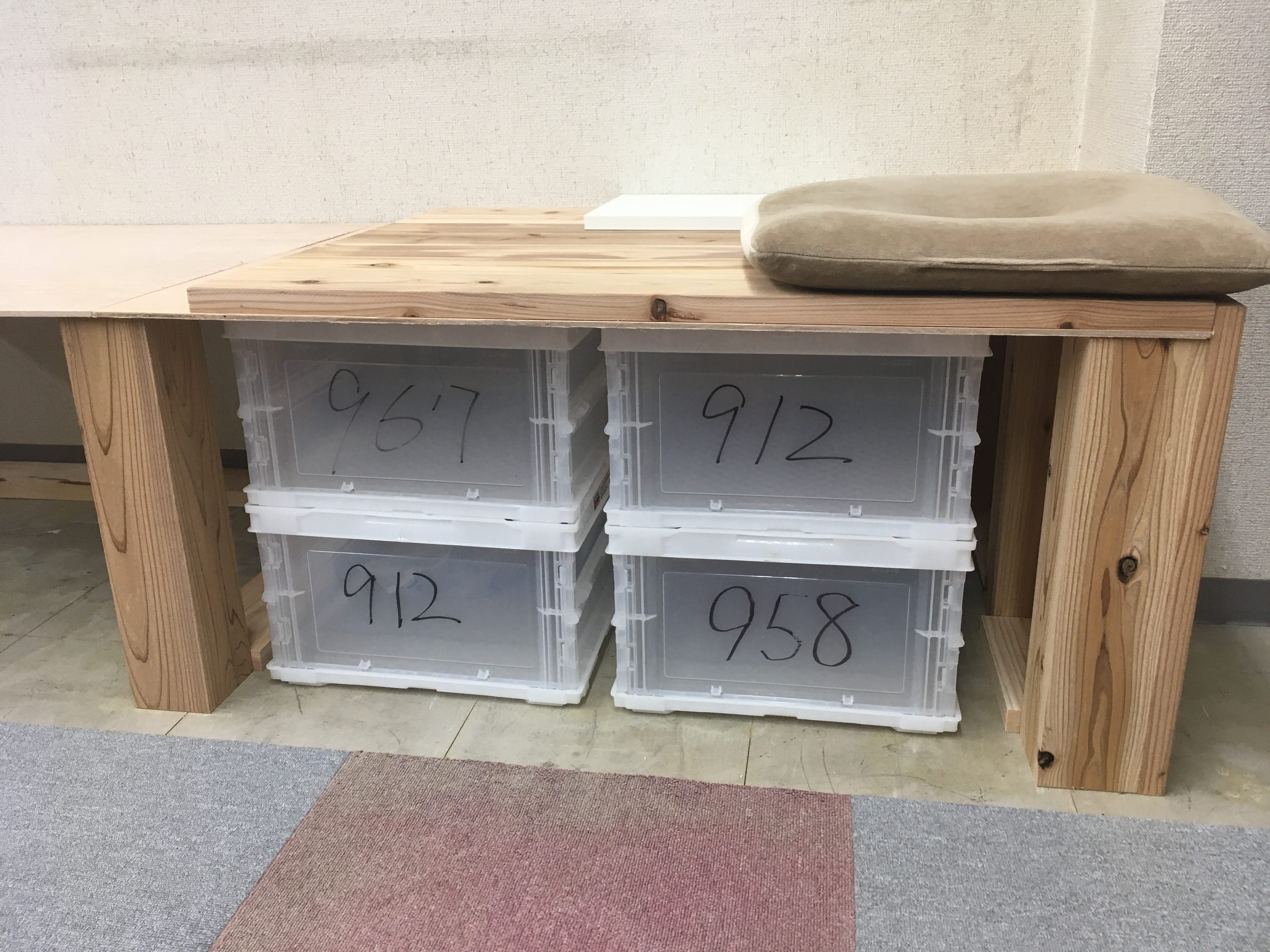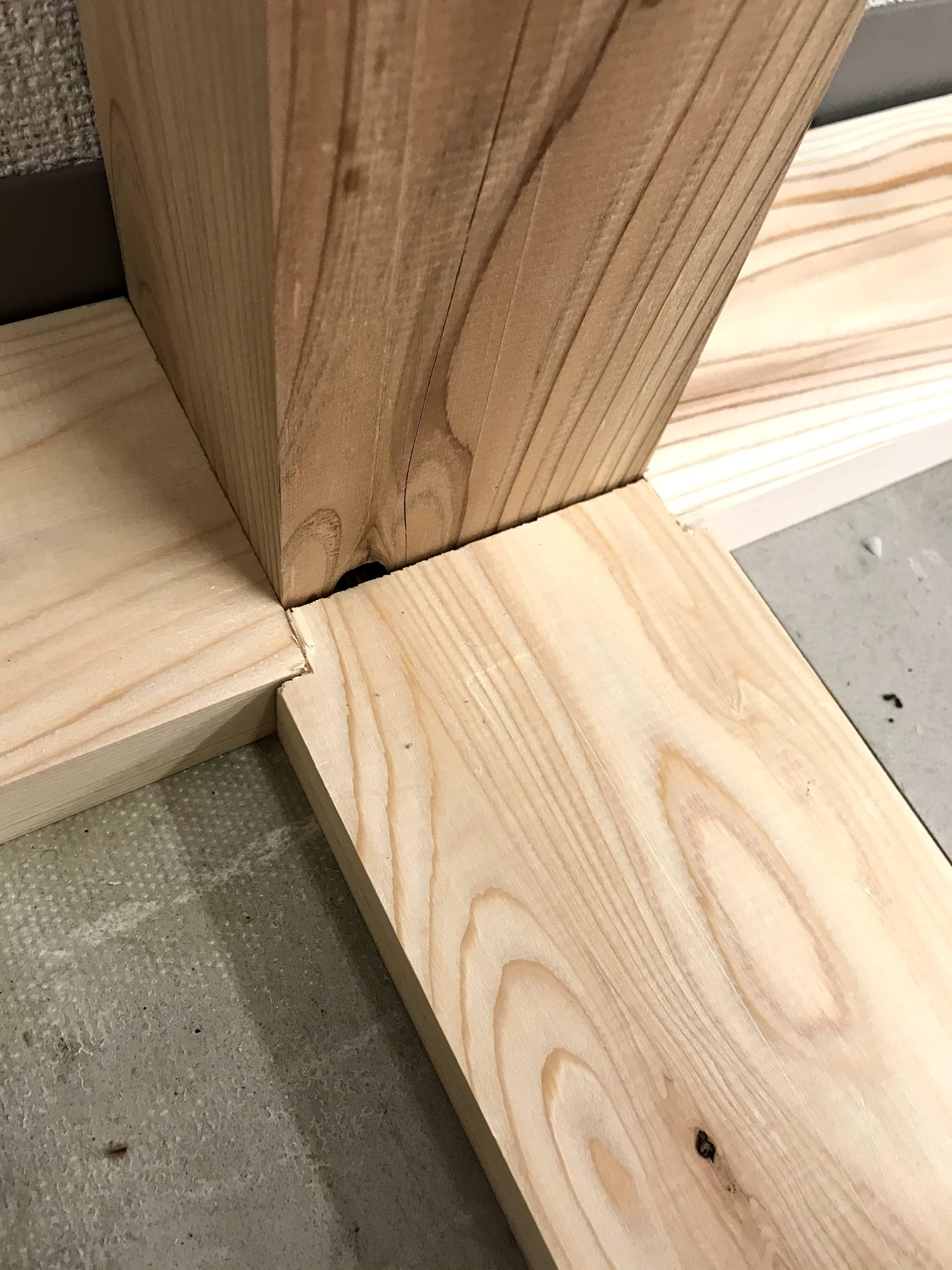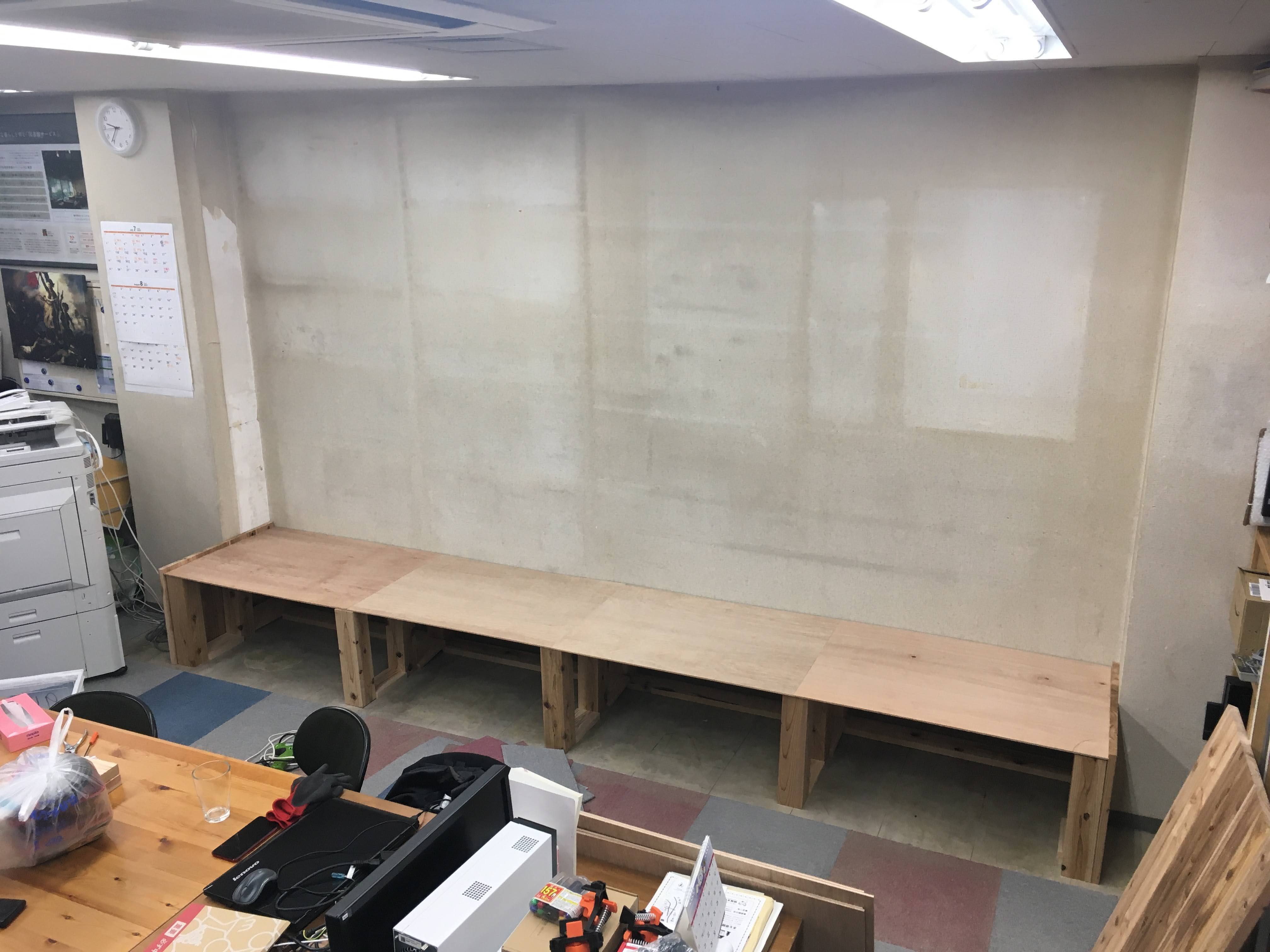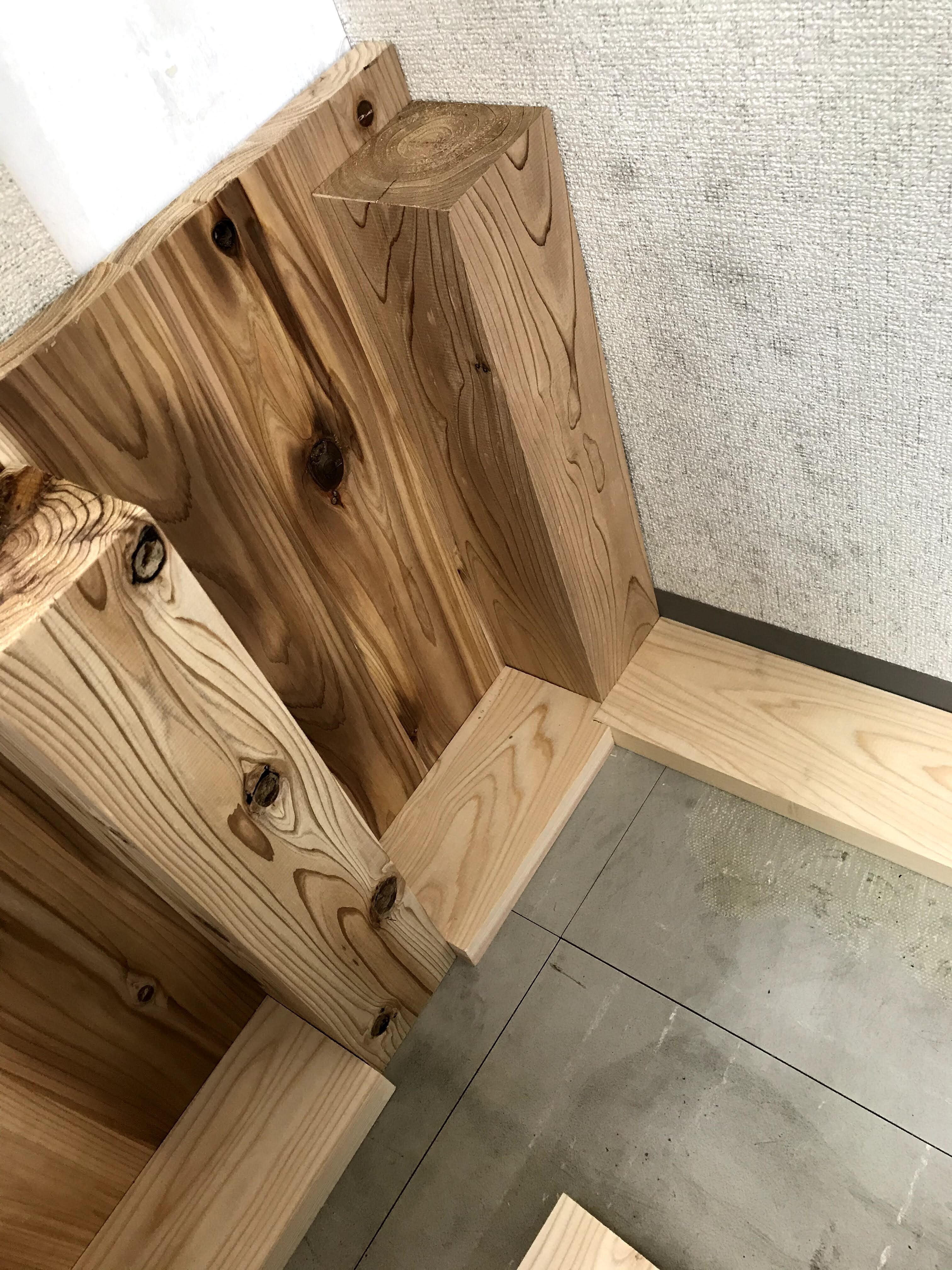前回、解体した本棚の跡地にはまた新しい同型の本棚を置く予定なのですが、ストッカーだけは自作しようと高座?の様な台を作り始めました。