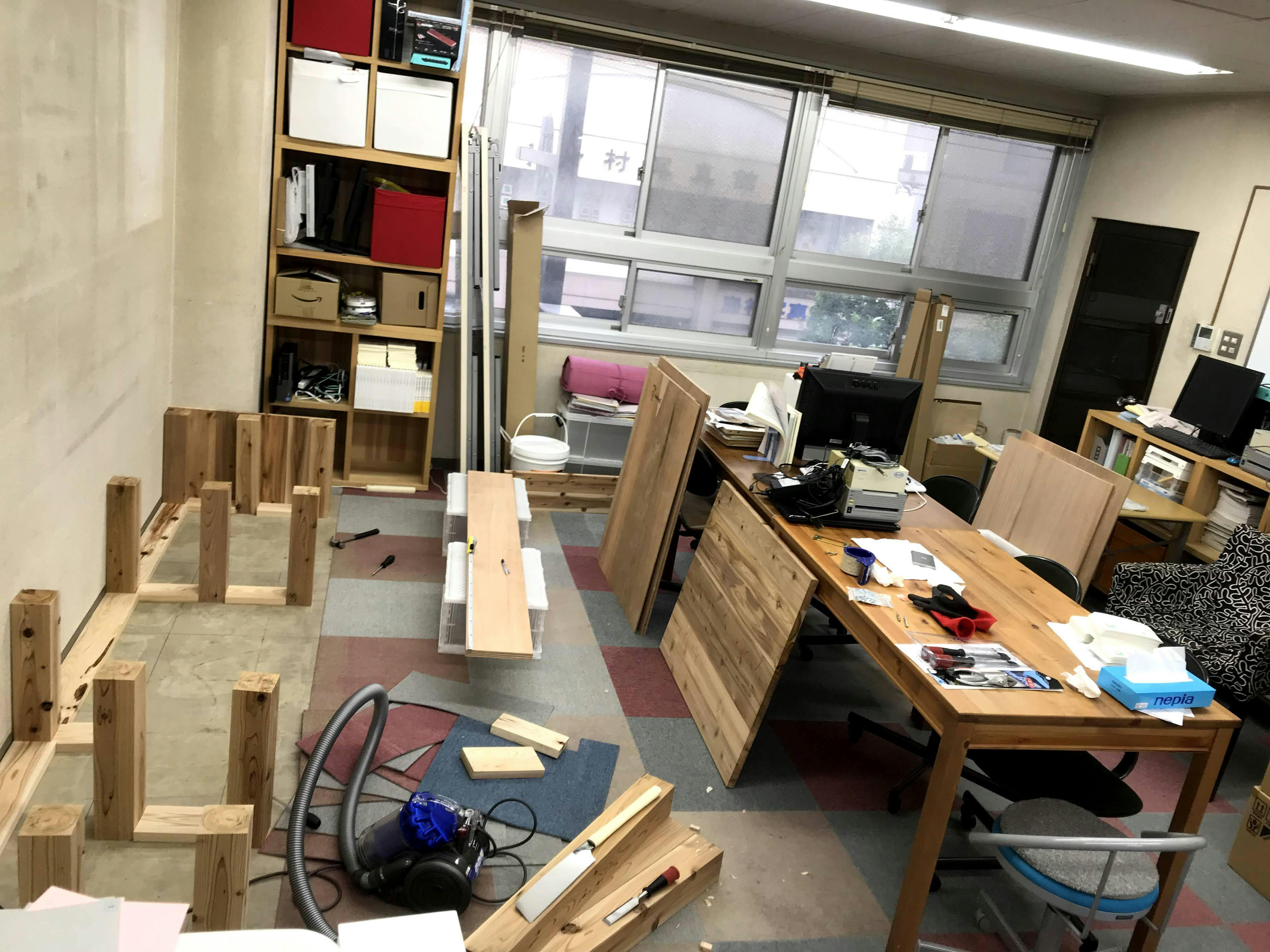 先日の高座組立の続きです。最終的には床も壁も造作しますが、すでに色々荷物があるので一部作って残り、さらに一部作って残りといった感じで少しずつ作業を進めていきます。今までのタイルカーペットは養生替わりです。