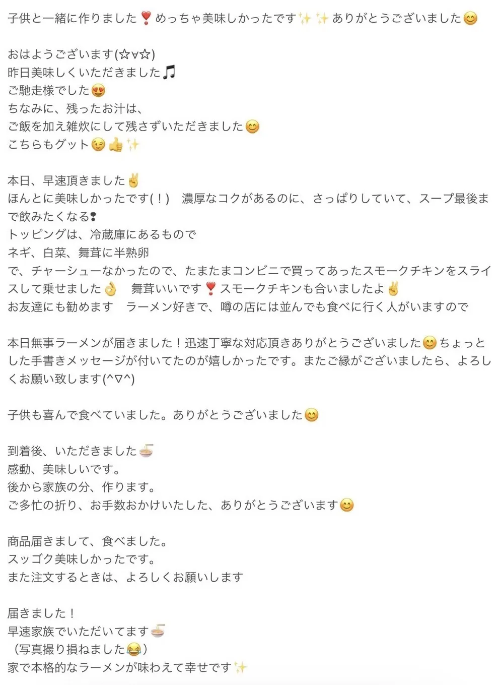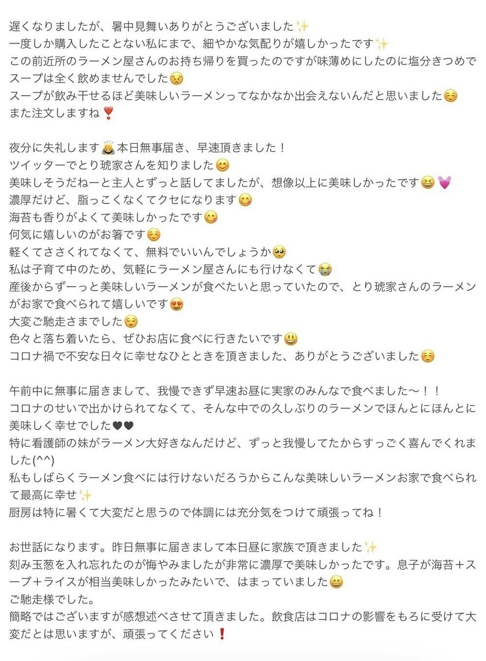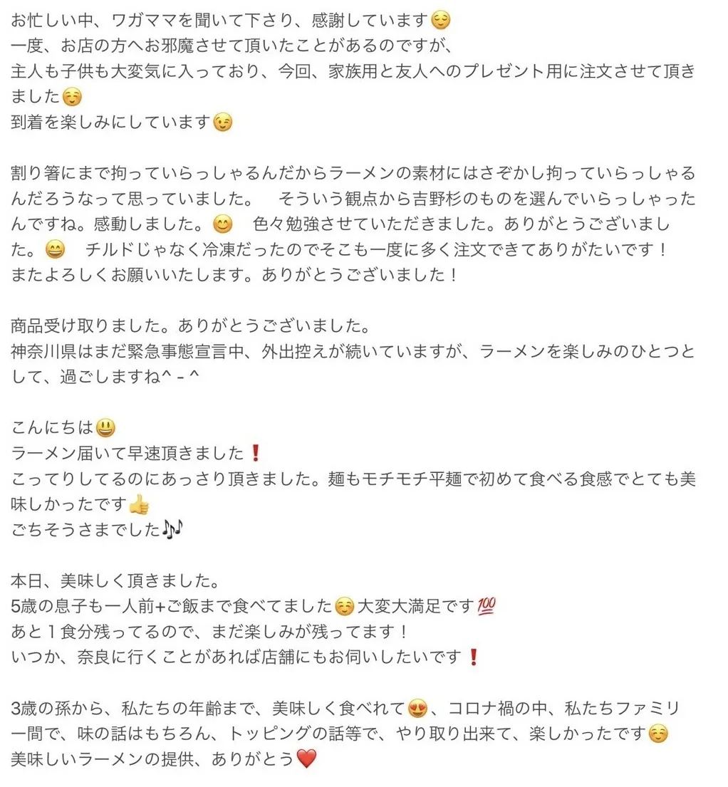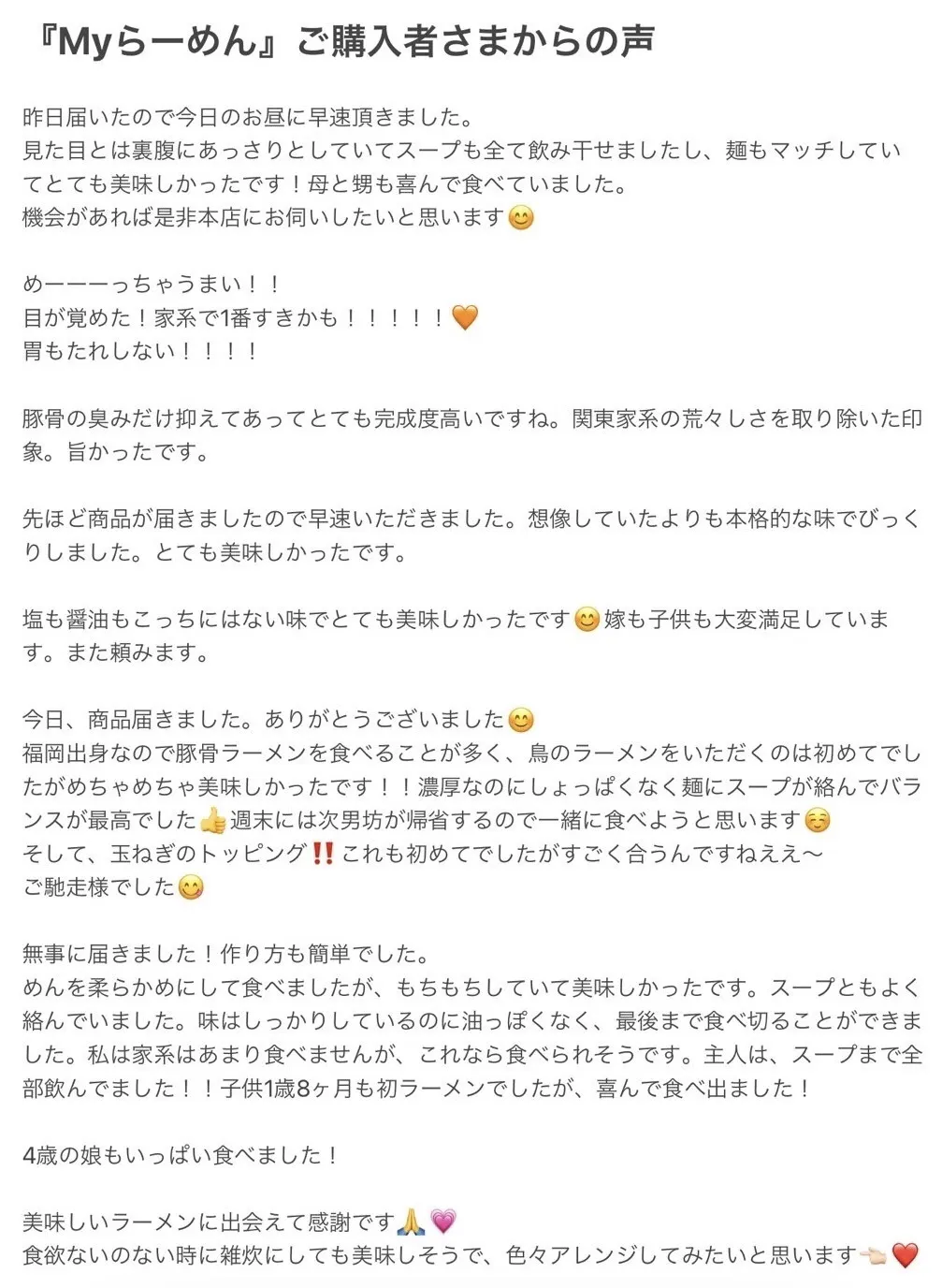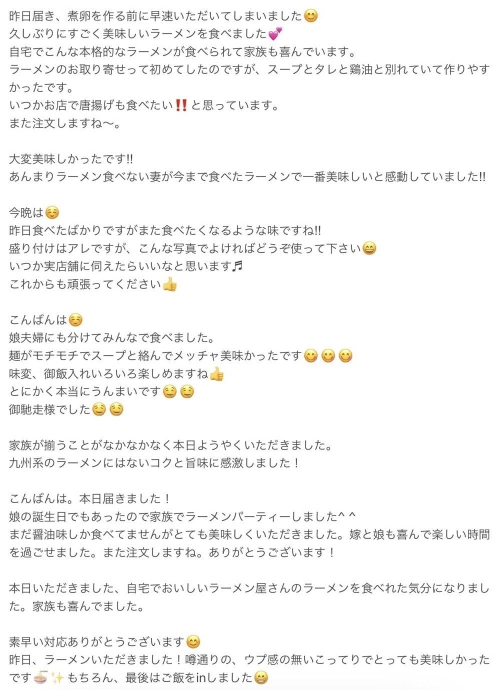 また、有り難いことにお取り寄せ『Myらーめん』のご感想をたくさんいただいており、どれも励みになるもので選び切れません。そのため、ページの最後の方に載せていますので、そちらもご覧いただけたら嬉しいです!!